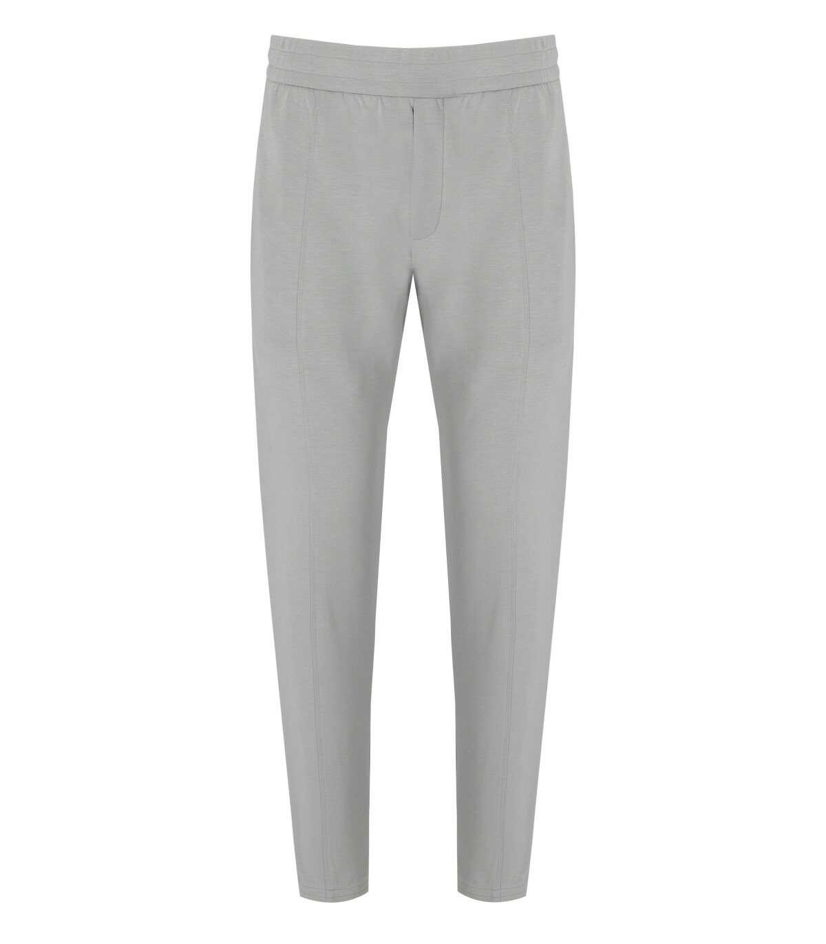 Trousers by Emporio Armani made of a mixed modal fabric in gray. Characterized by a soft cut, finished with vertical lines near the seams, it features an elasticized waistband and side pockets at the front. At the back, it has two fake pockets. Adorned with an embroidered fabric logo on the back, above the right pocket. Loose fit.