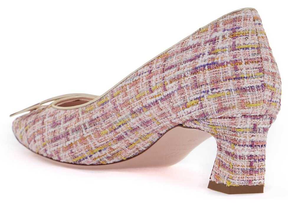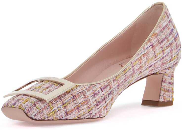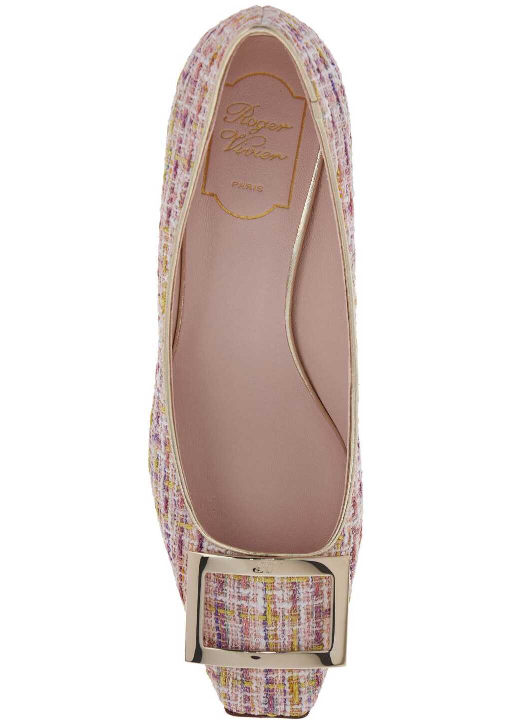 The Belle Vivier Dé colleté by Roger Vivier is made of tweed and features the iconic gold metal buckle with the RV logo. The trompette heel is covered in patent leather, while the interior is lined with leather and the sole is made of leather as well.