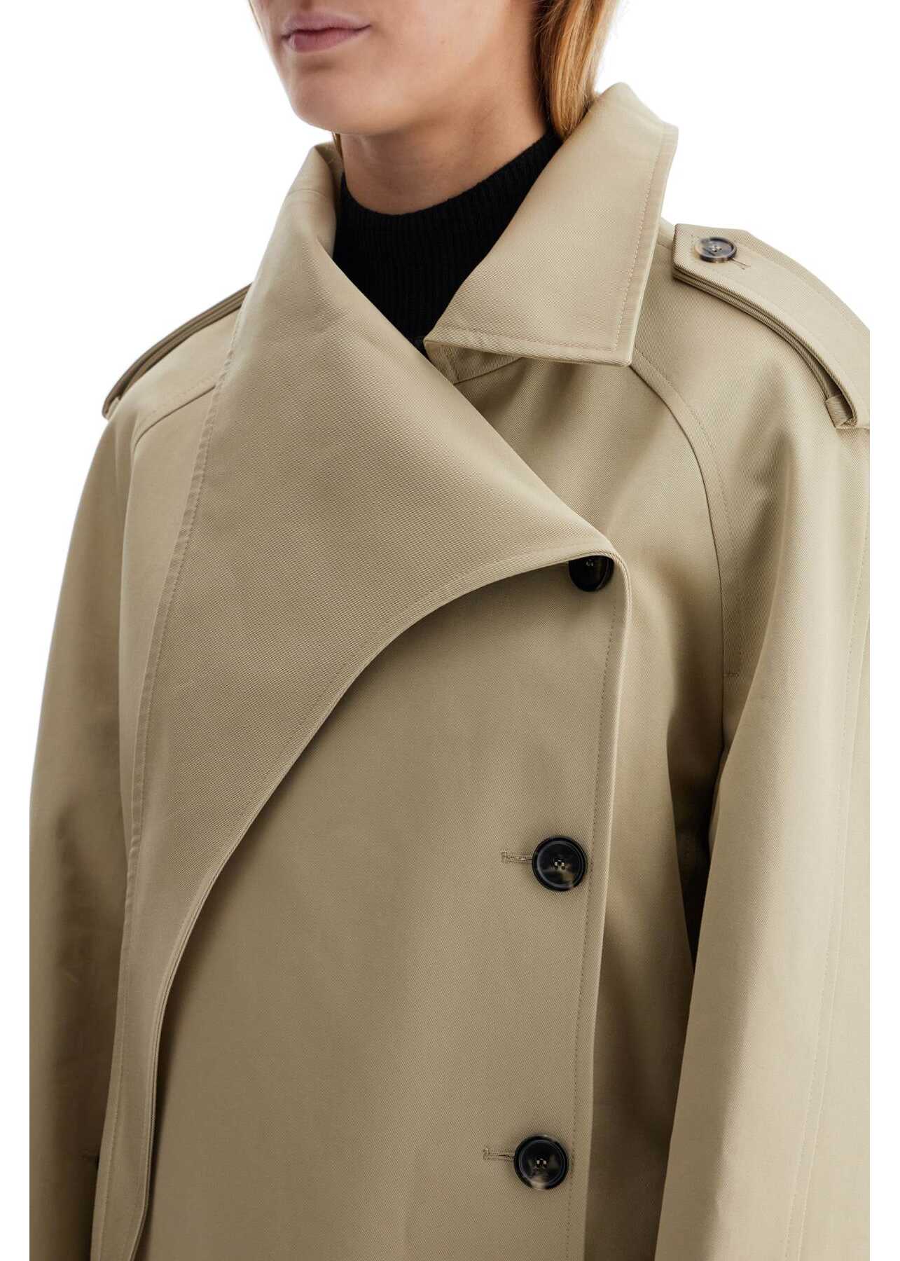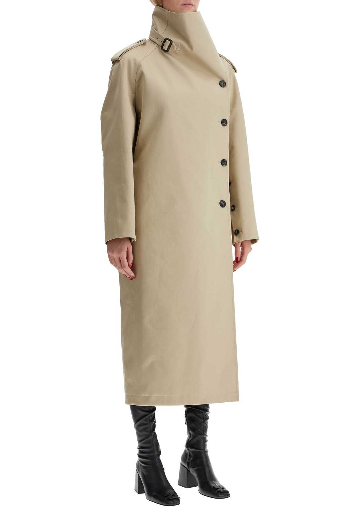 This long Courrè ges trench coat is made of pure cotton twill and features a double-breasted closure with a maxi strap to wrap around the neck and tie at the front leather buckle. It has a convertible collar, shoulder epaulettes, buttoned raglan sleeves, and a back slit. A waist belt completes the piece. Fully lined. The model is 177 cm tall and wears size S.