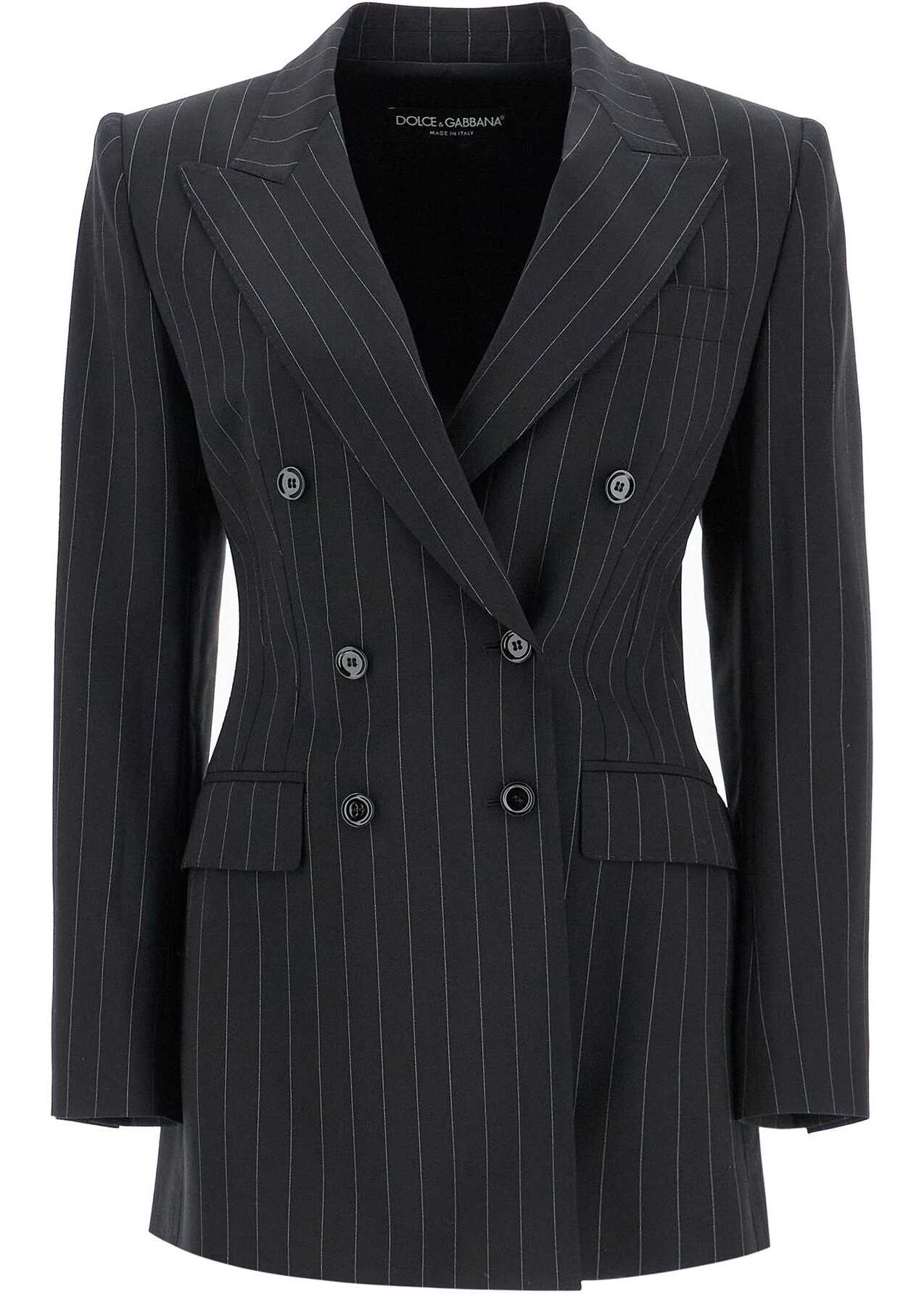 This Dolce & Gabbana double-breasted jacket has a slim fit and structured shoulders, made from comfortable stretch wool pinstripe fabric. The design features a wide peak lapel collar, six-button closure, center back vent, two flap pockets, and a chest pocket. The interior is lined with stretch silk satin. The model is 177 cm tall and wears an Italian size 40.