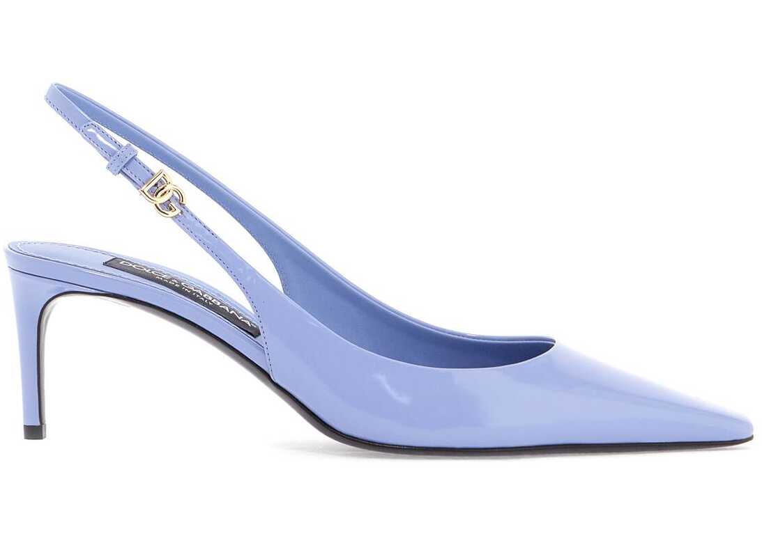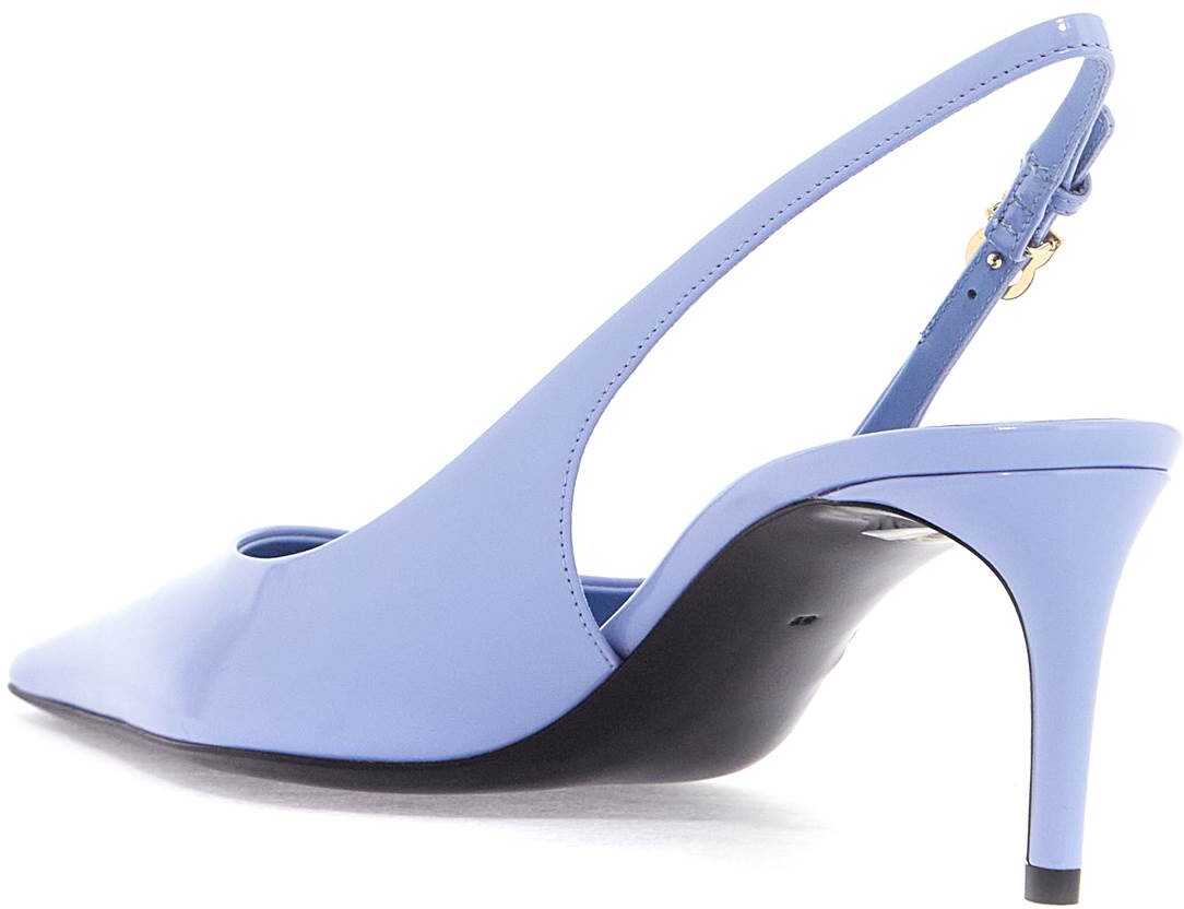 These Dolce & Gabbana slingback pumps are made of glossy leather with a pointed and squared toe. They feature an adjustable strap with a DG gold metal buckle, a leather insole, and a leather sole.