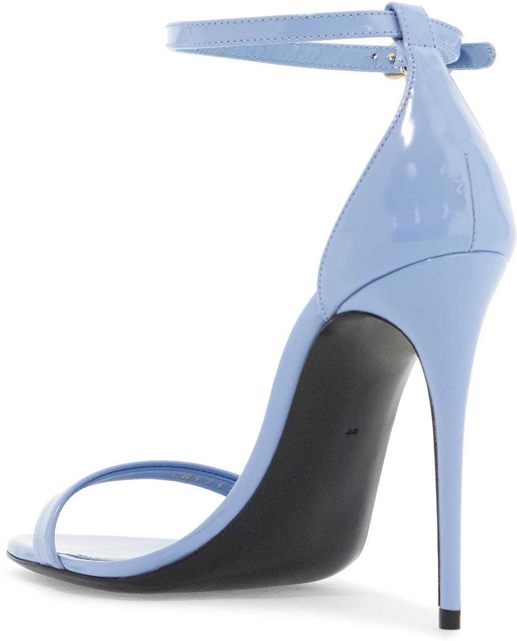 Dolce & Gabbana sandals made of glossy leather with a stiletto heel and rounded toe. Adjustable ankle strap with DG gold metal buckle, leather insole and leather sole.