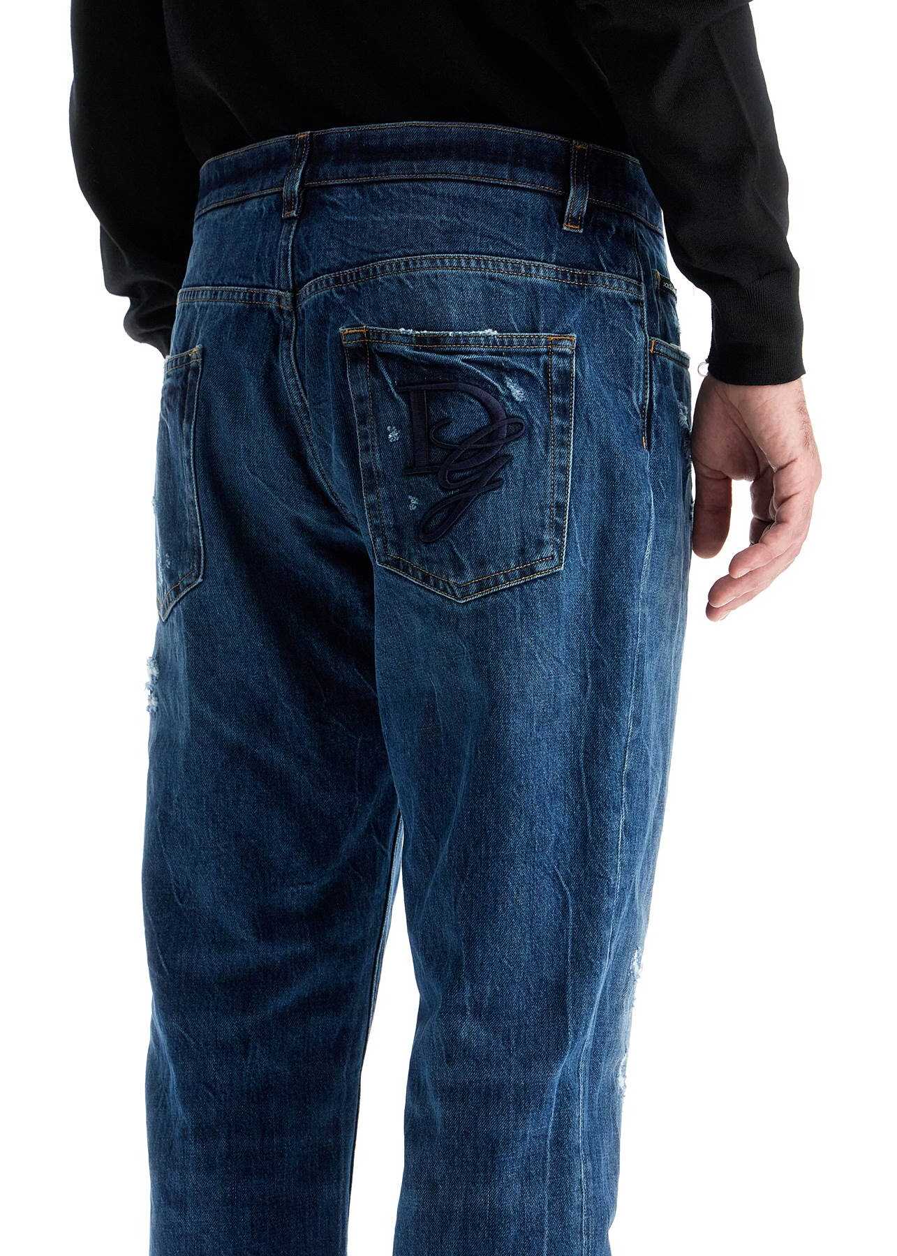 Loose Dolce & Gabbana jeans with a tapered low waistline, made of distressed denim. Classic five-pocket construction complete with belt loops and button and hidden zip closure. The garment is finished with contrasting stitching and DG embroidery on the back pocket. The model is 182 cm tall and wears size IT 48.