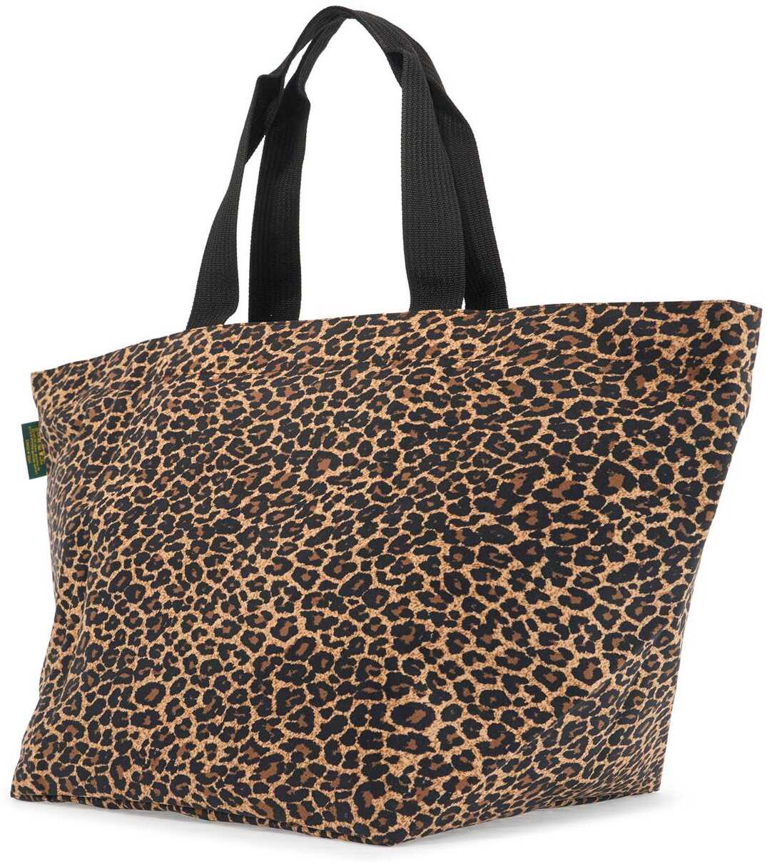 The Hervé Chapelier tote bag is made of printed leopard nylon fabric with a square base. It features a double zip closure, an unlined interior with a zip pocket, and ribbon handles.