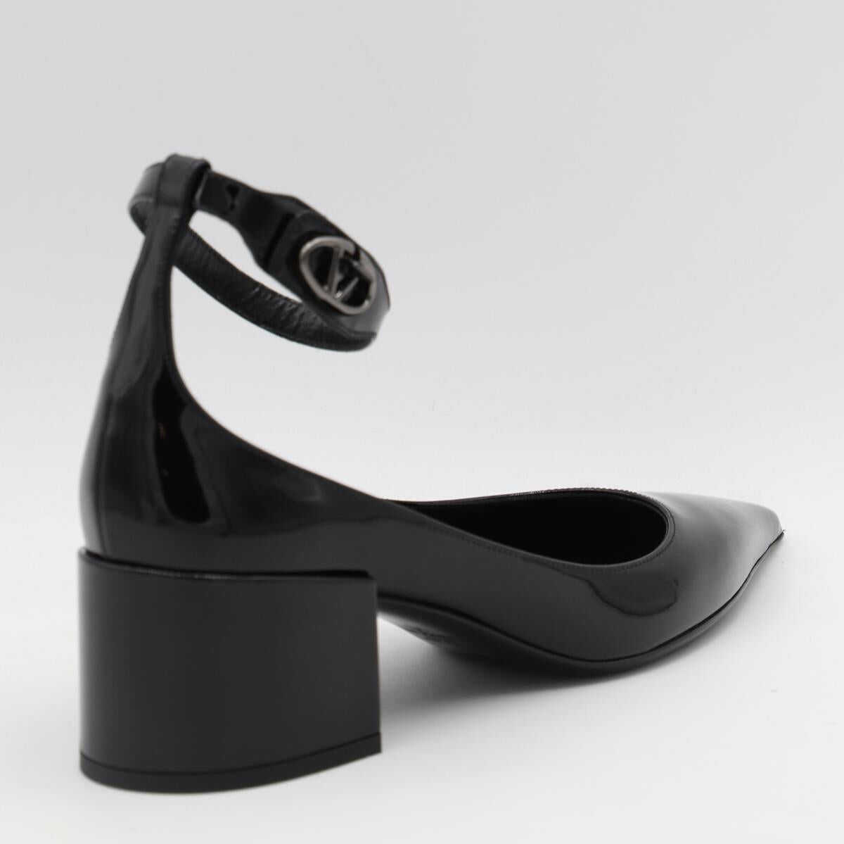 Black leather pumps from Valentino Garavani featuring pointed toe, buckle fastening, square heel, leather sole and gold tone hardware.