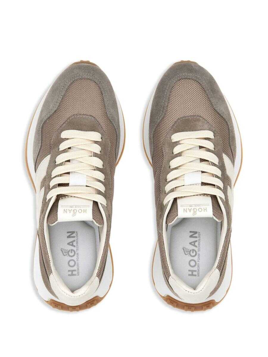 taupe brown panelled design suede panelling mesh panelling logo patch to the side logo patch at the tongue contrasting heel counter almond toe front lace-up fastening branded insole flat rubber sole