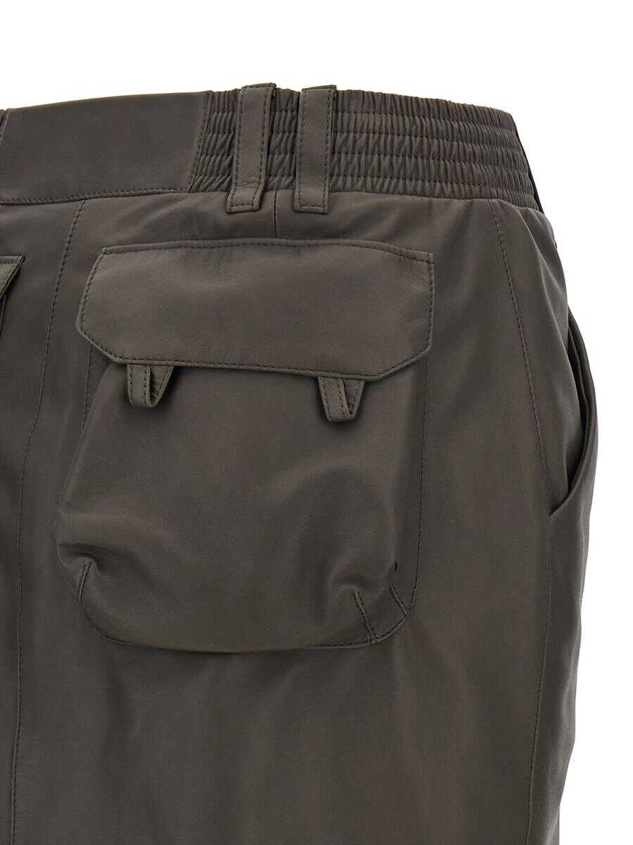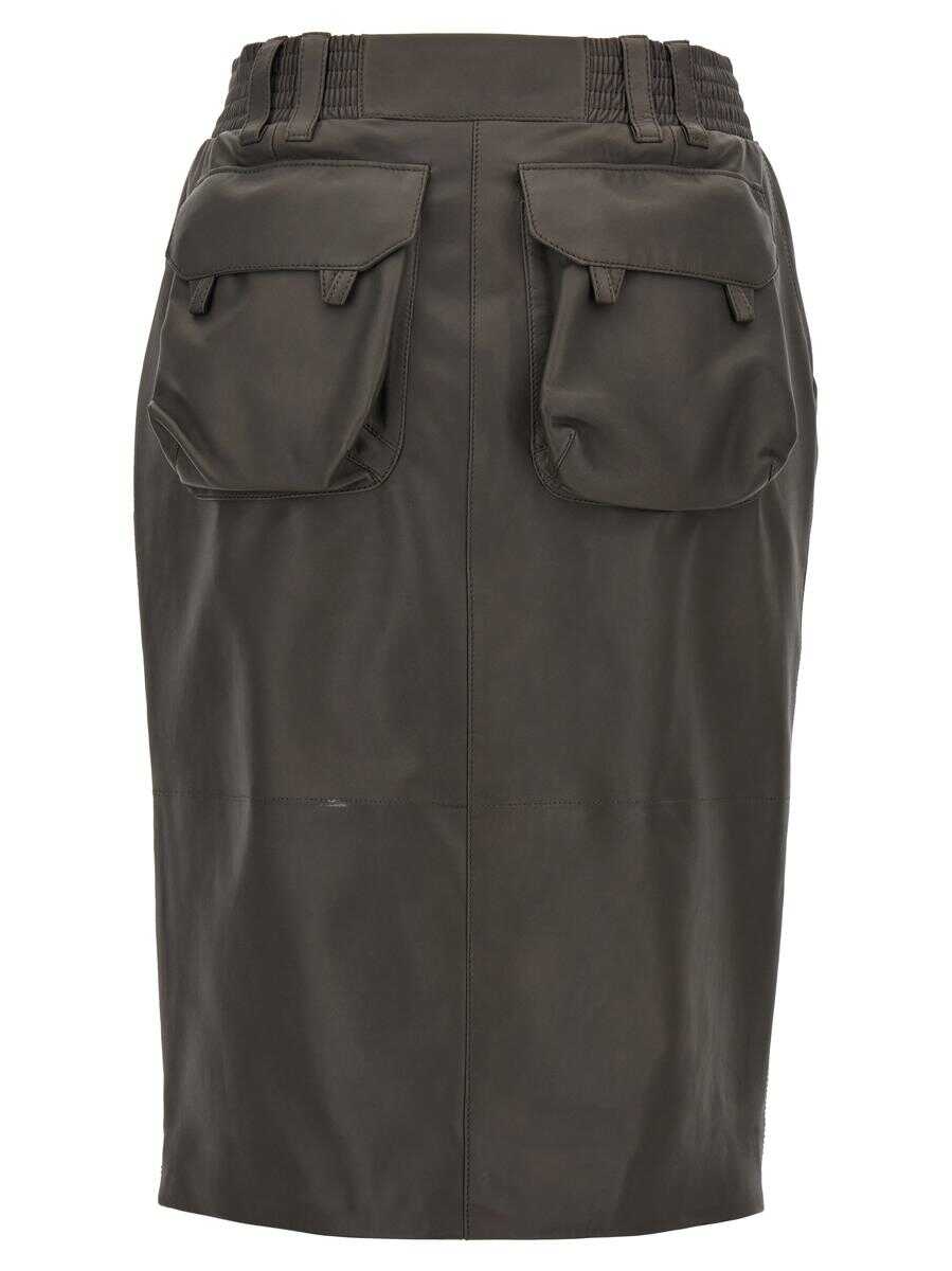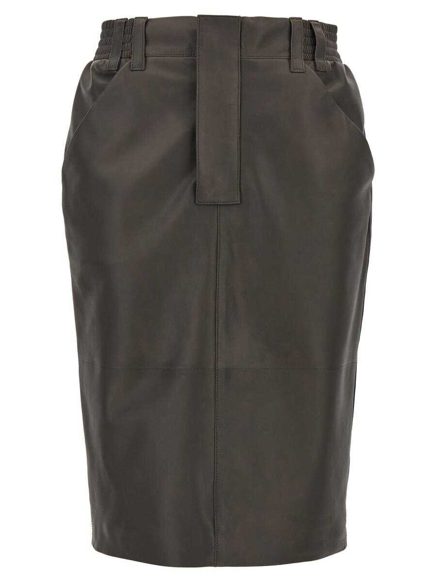 Leather skirt, silk lining, zip and button closure, pockets, belt loops