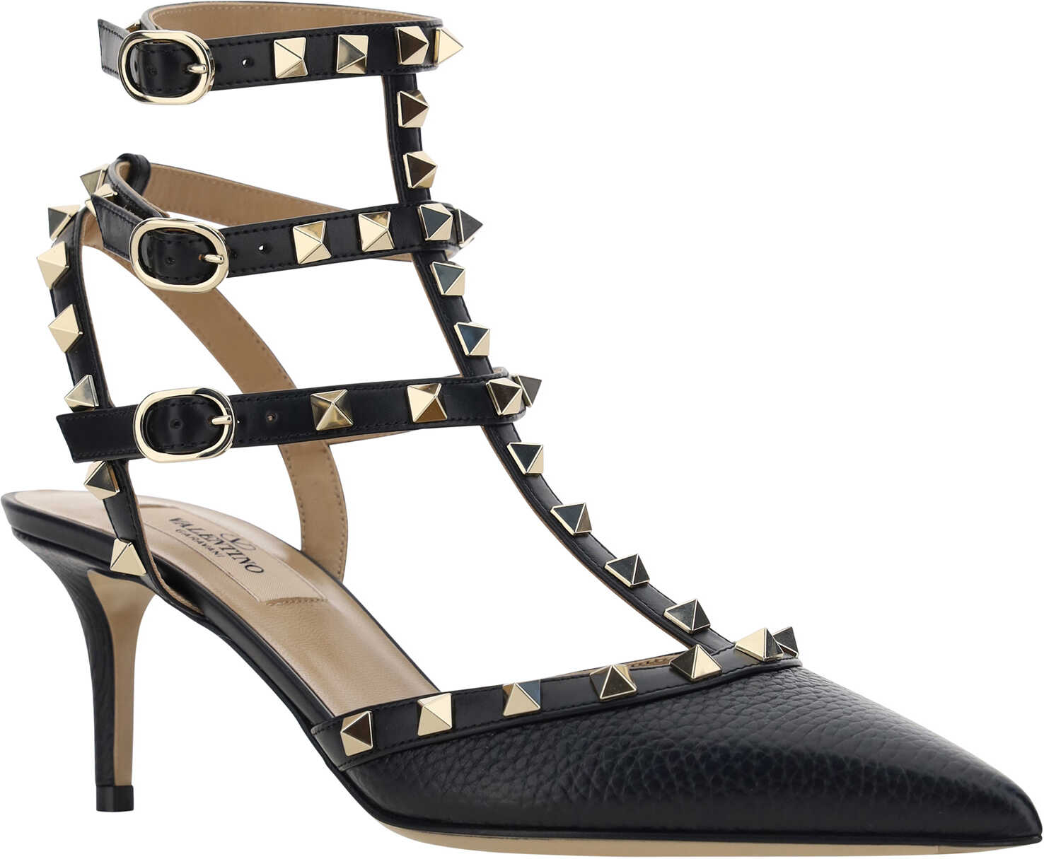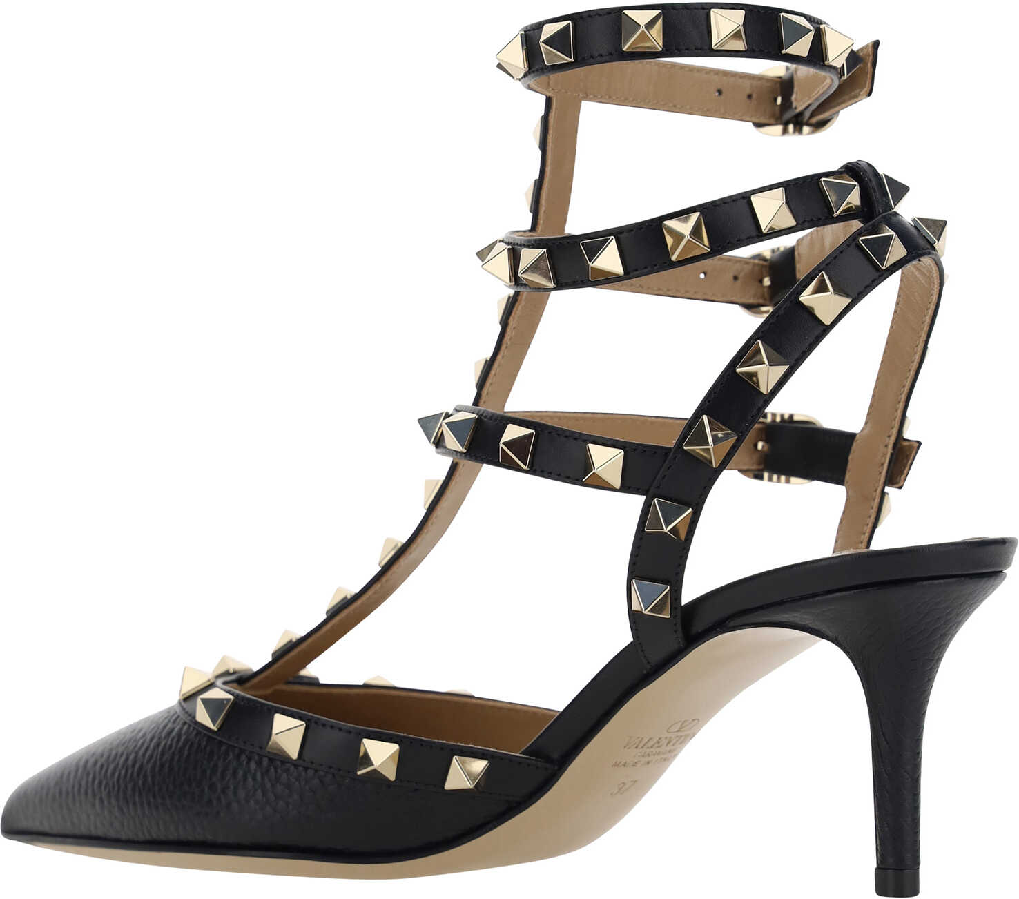Leather Rockstud Pumps by Valentino Garavani, elongated geometric toe, adjustable ankle lap strap closure with triple side buckle fastening, leather stiletto heel, iconic all-over brand applied studs, logoed insole.