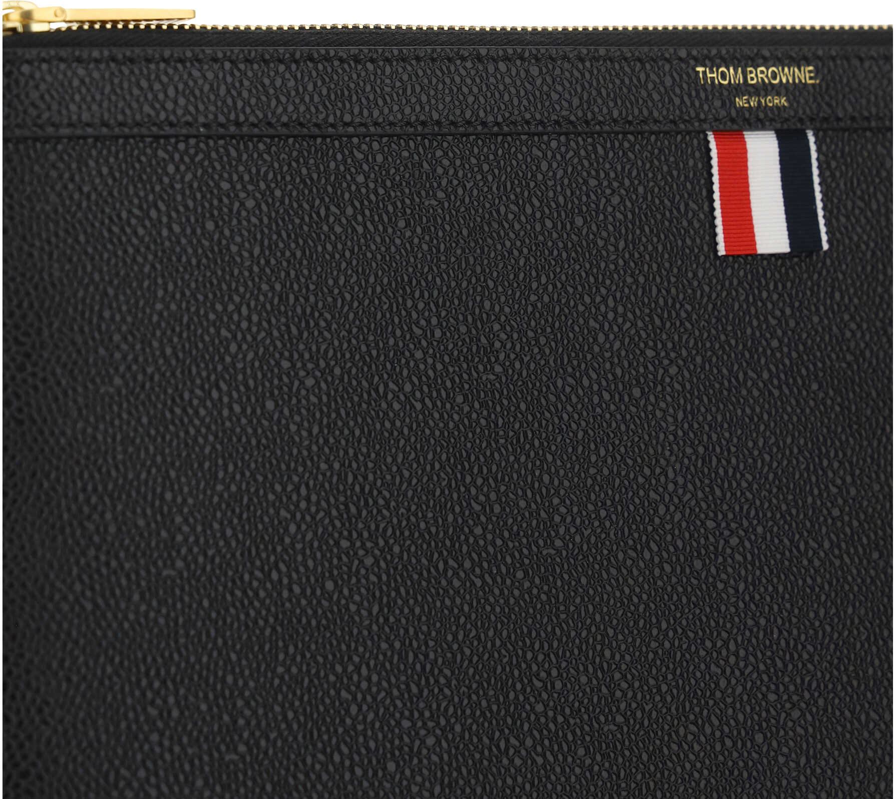 Black Pebble Grain Leather Document Holder by Thom Browne, gold zipper closure with brand logo on the slider, iconic tab with brand colors on the front, lined interior with brand colors and brand logo, pressure printed logo on the front.