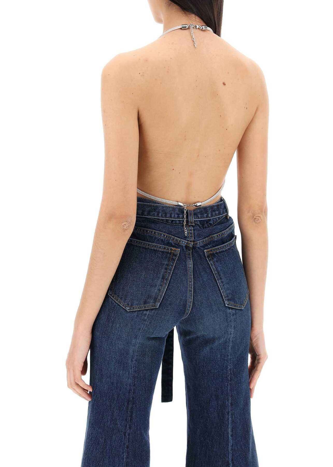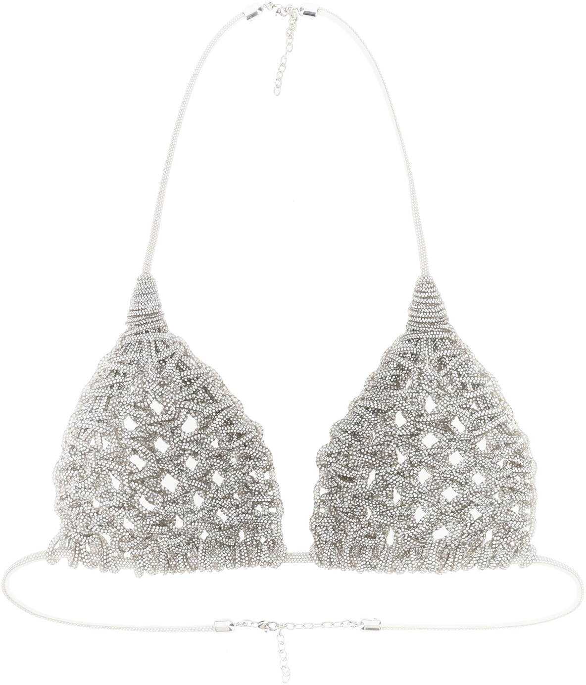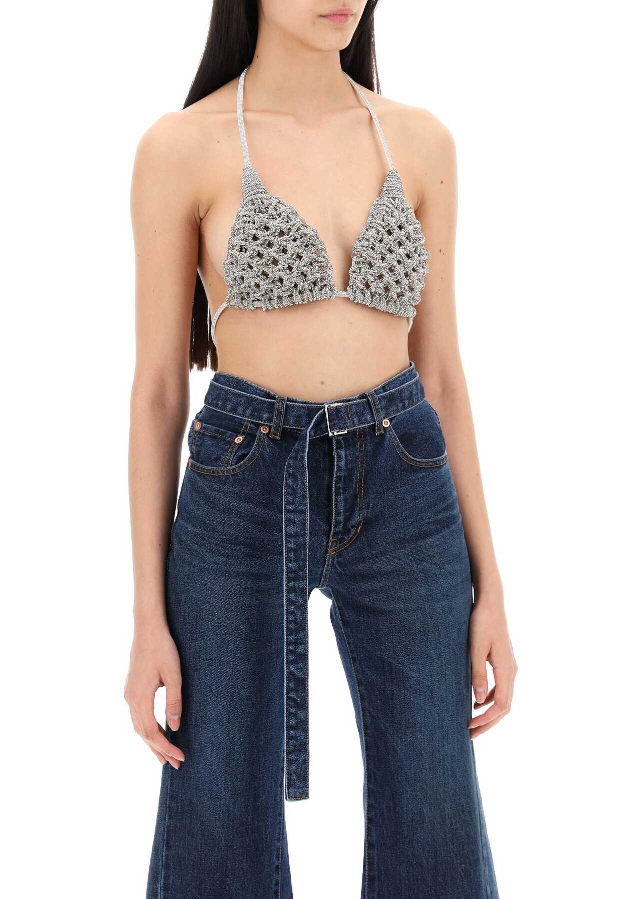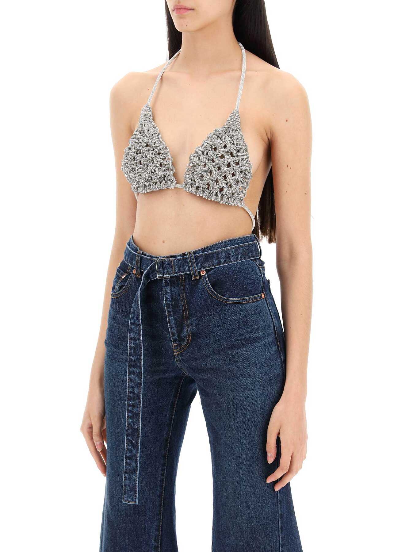 MVP Wardrobe halter triangle top designed in collaboration with Hibourama. Made of hand-braided cords studded with micro crystals, it features an adjustable lobster-clasp fastening at the neck and back. The model is 177 cm tall, one size fits all.