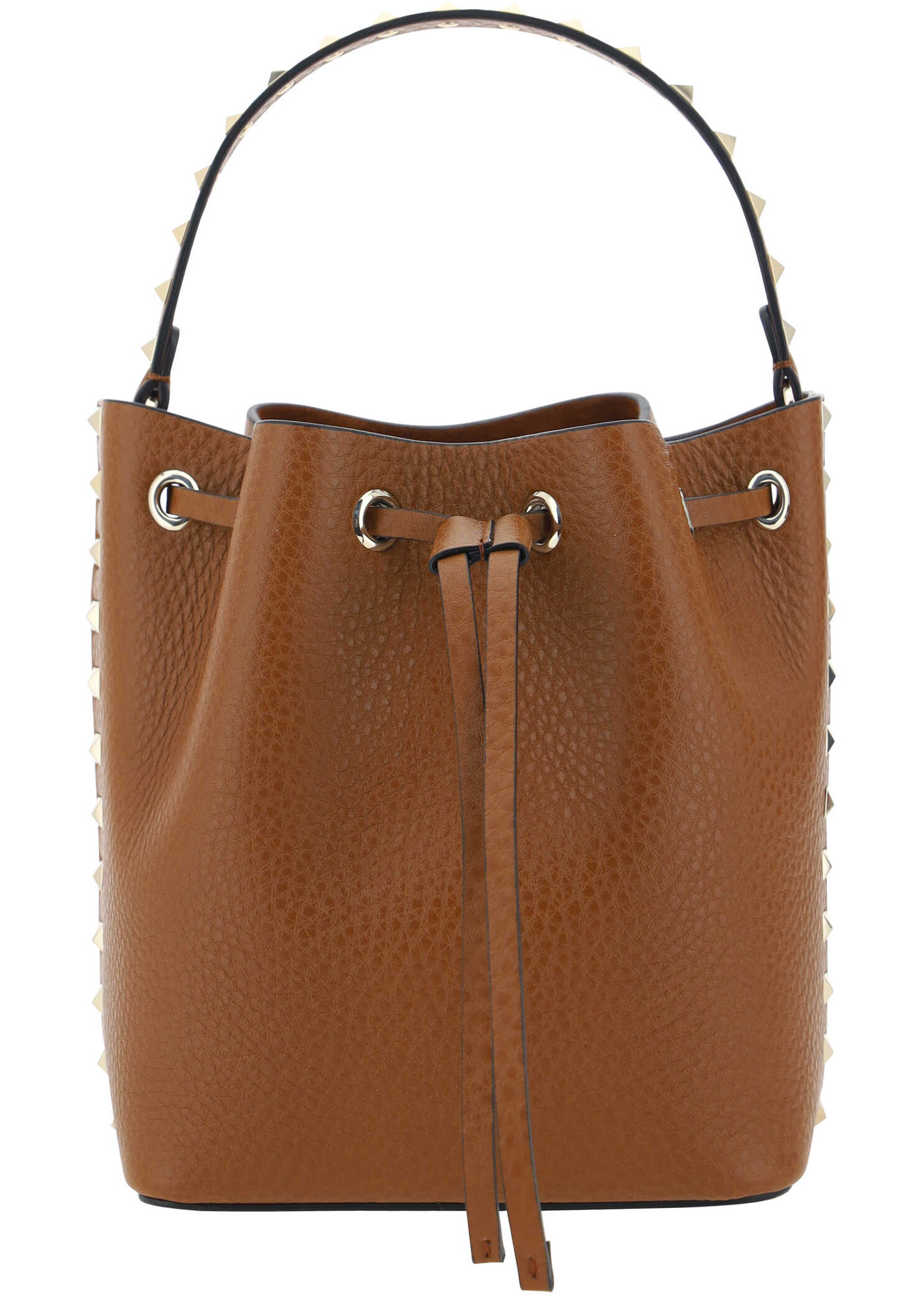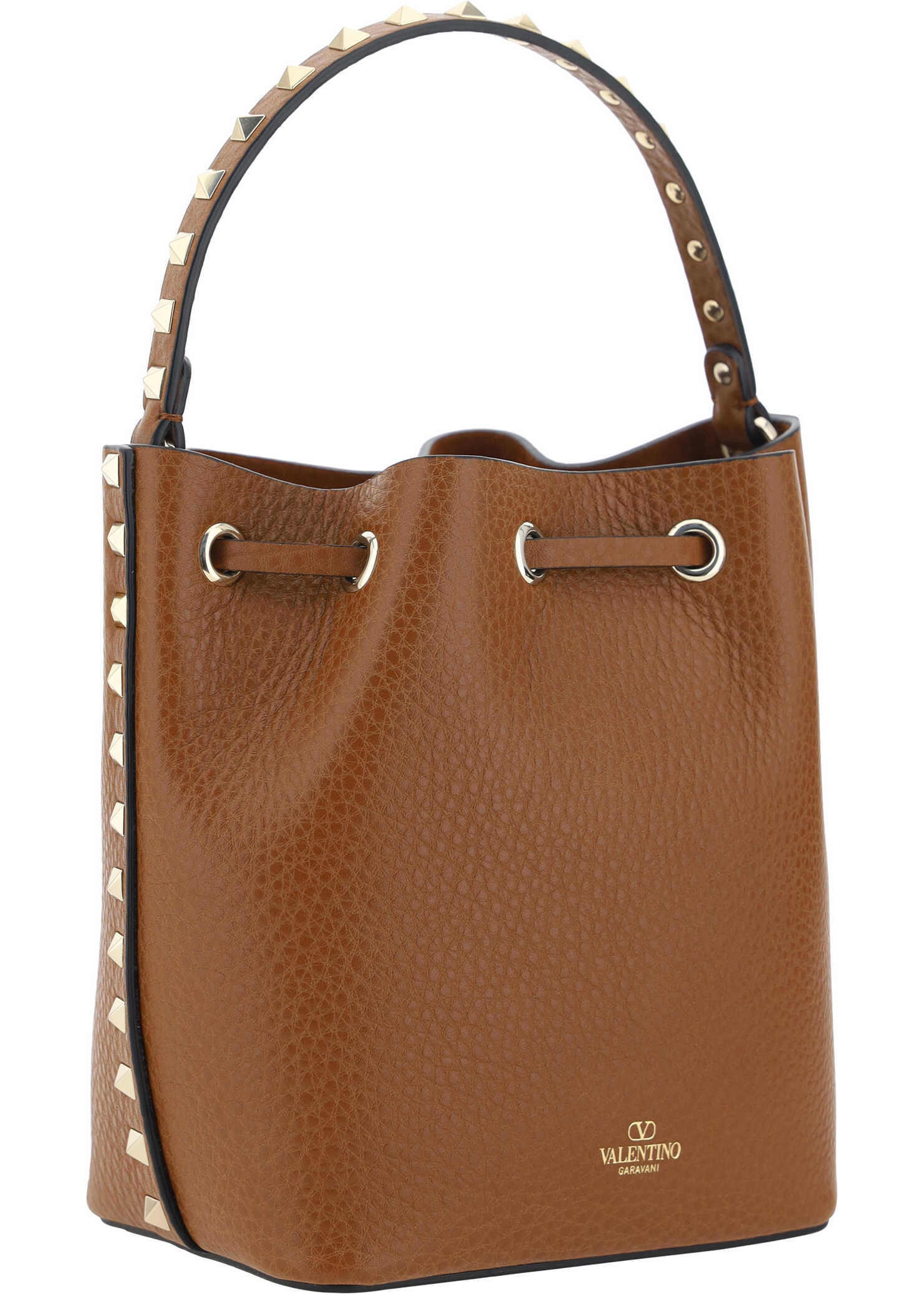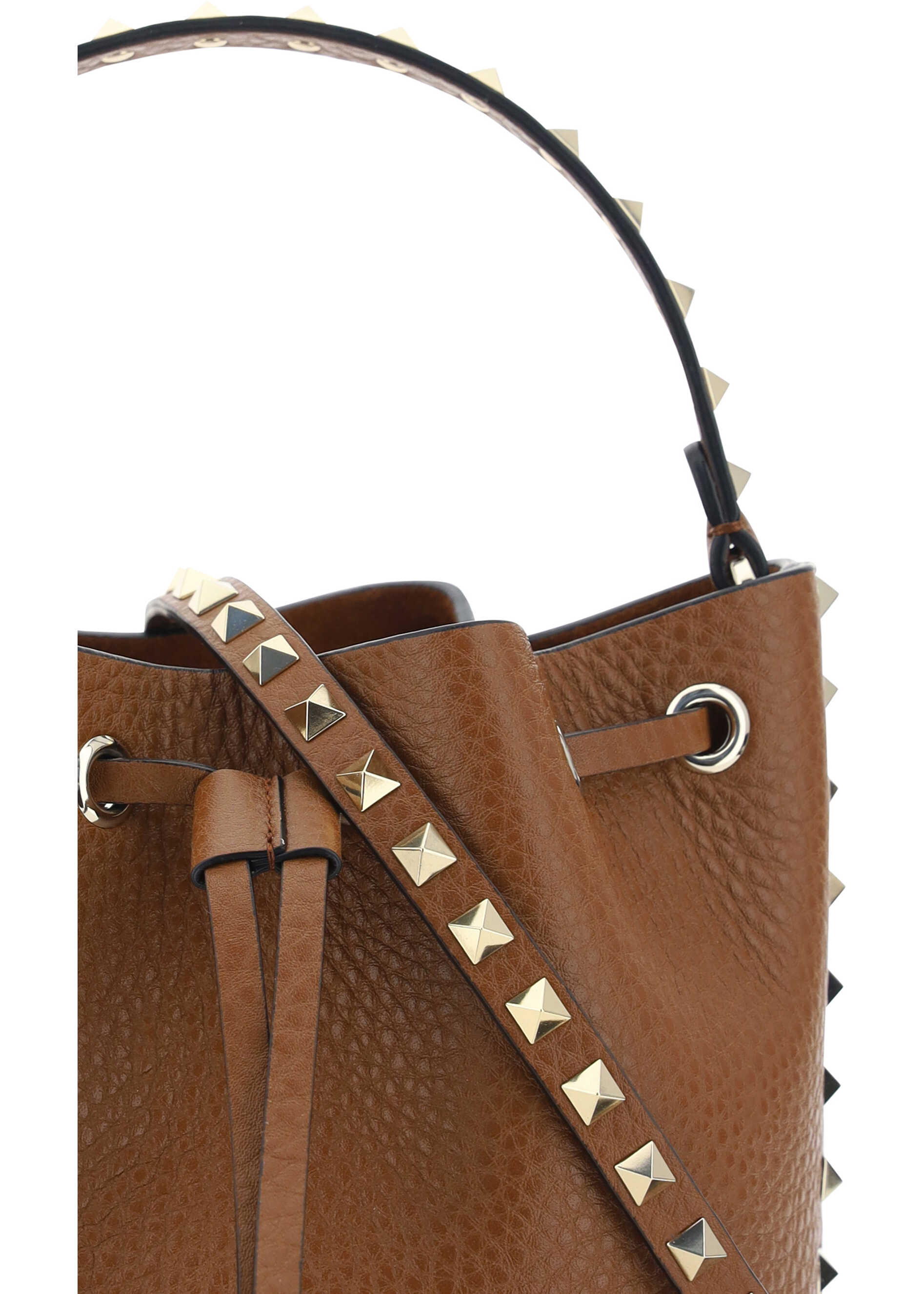 Calfskin Rockstud Bucket Bag by Valentino Garavani, top closure via leather drawstring, single top handle embellished with the brand's iconic metal studs, profiles embellished with Rockstud studs, single lined interior compartment, garnet leather design.