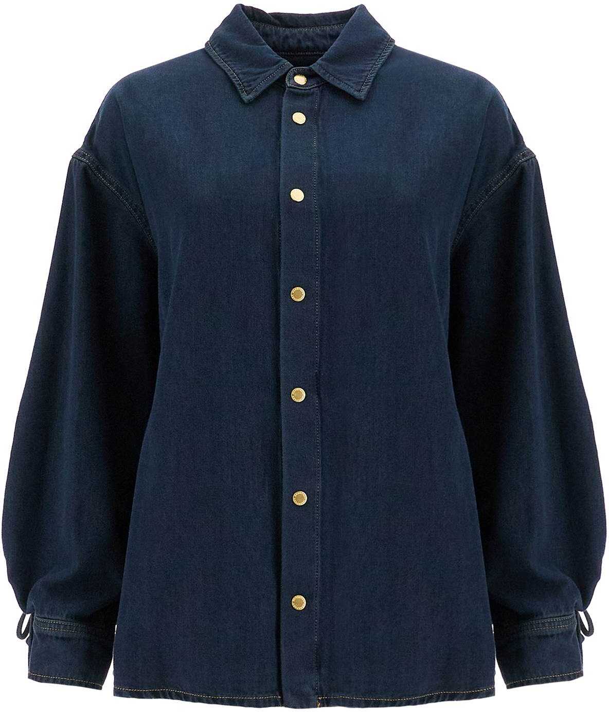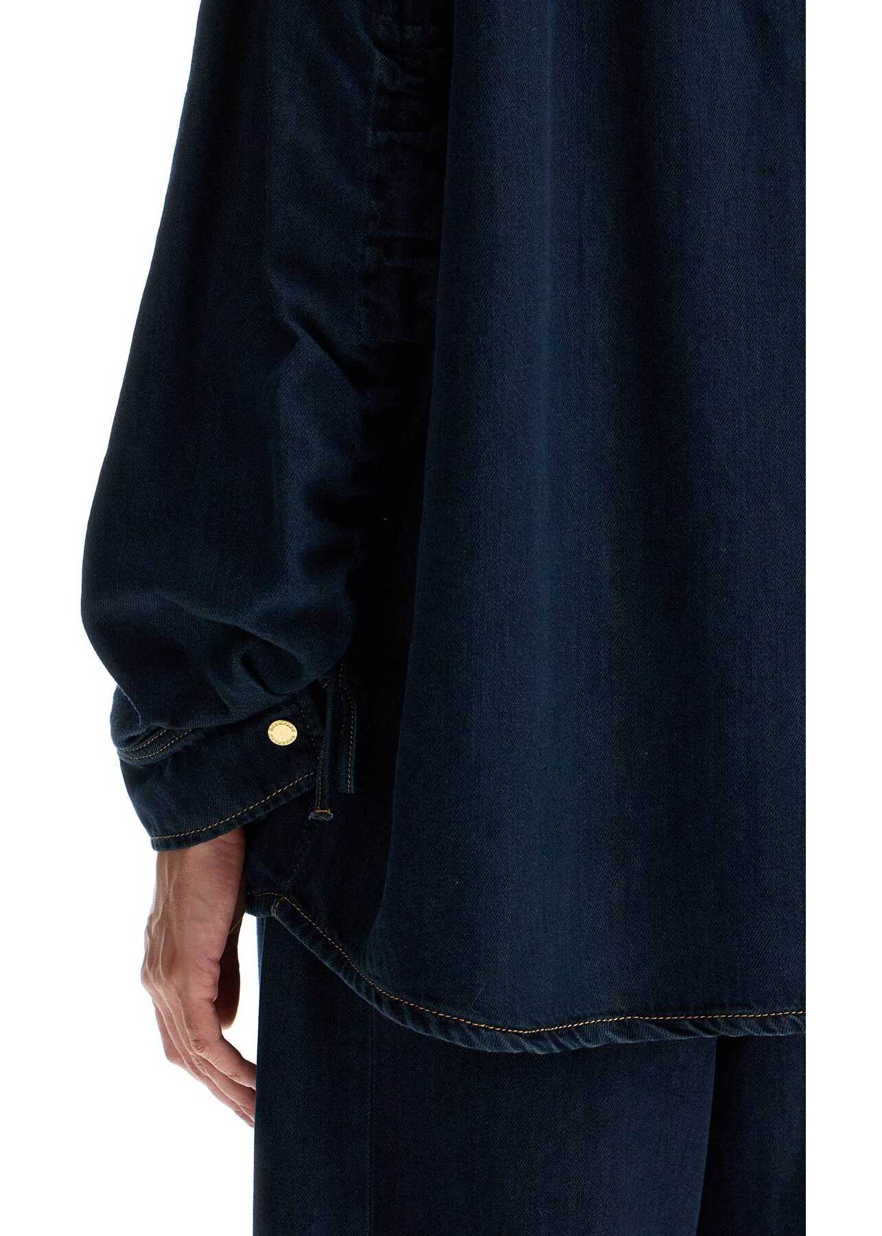 The DARKPARK denim shirt in Tencel has a classic design with a collar, front button closure, and adjustable sleeves with drawstrings. The oversized fit is complemented by dropped shoulders and a tonal embroidered DP logo on the chest. The model is 177 cm tall and wears a size S.