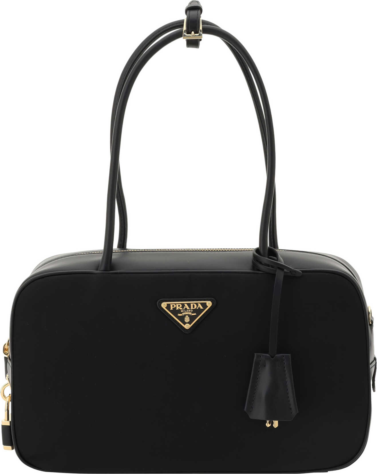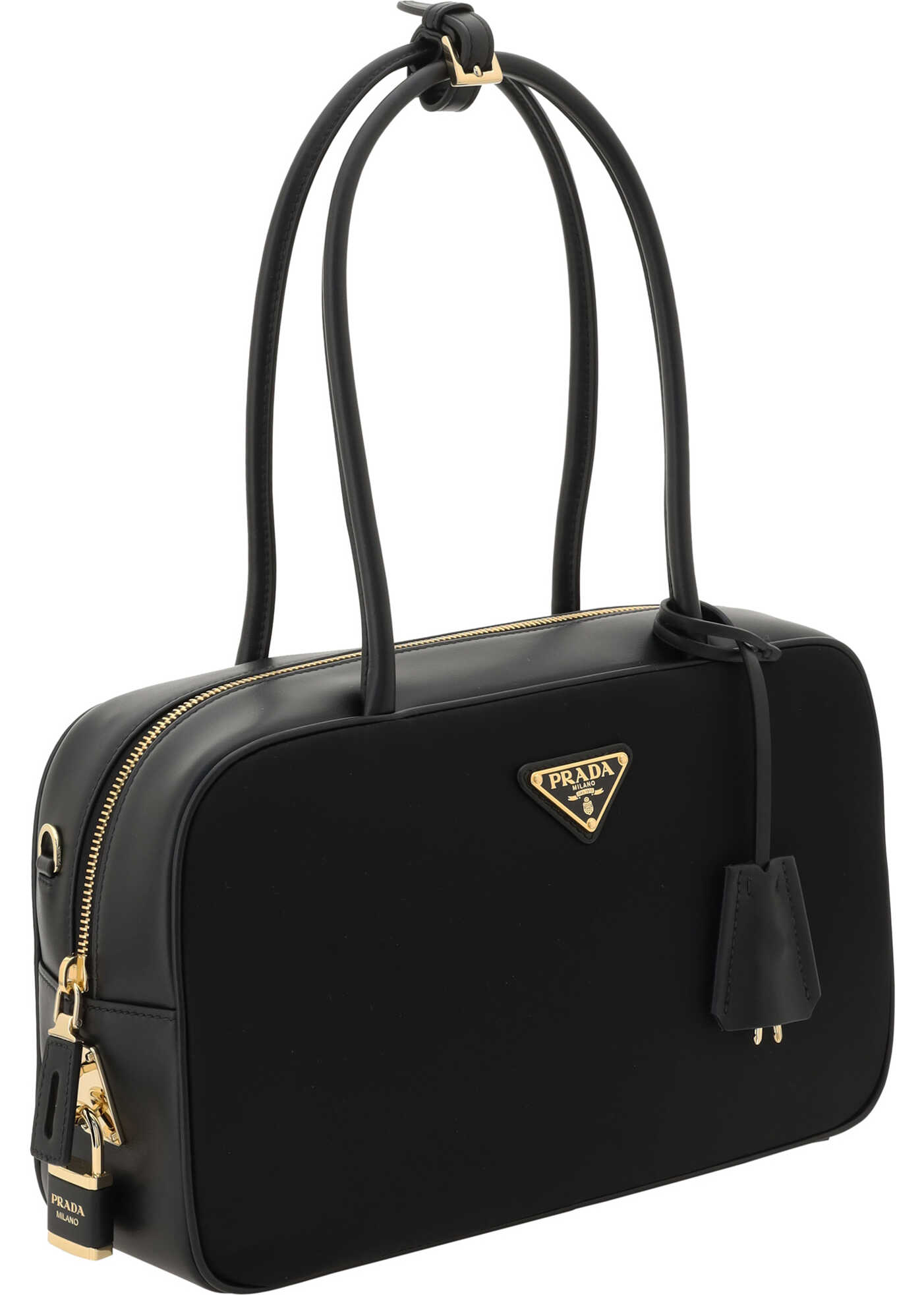 Re-Nylon Shoulder Bag by Prada, top zipper closure, two tubular handles at top, logoed padlock detail applied at side, padlock key charm applied at base of handle, iconic enameled triangular plaque applied at front, one interior compartment.