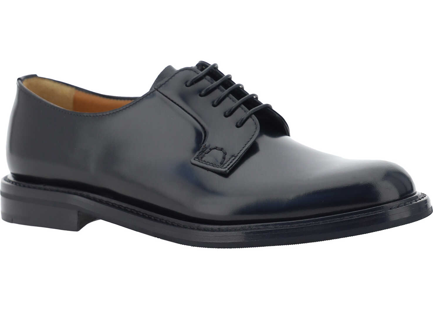 Calfskin Shannon Lace-Up Shoes by Church's featuring an almond toe, front lace-up closure, slight leather block heel, patent leather design, press-on logo insole.