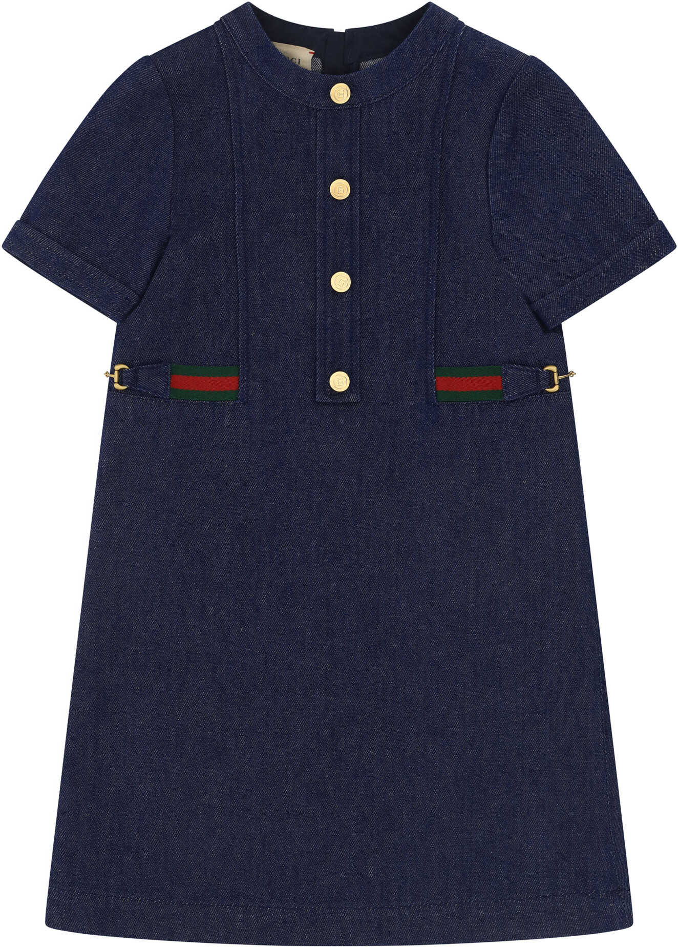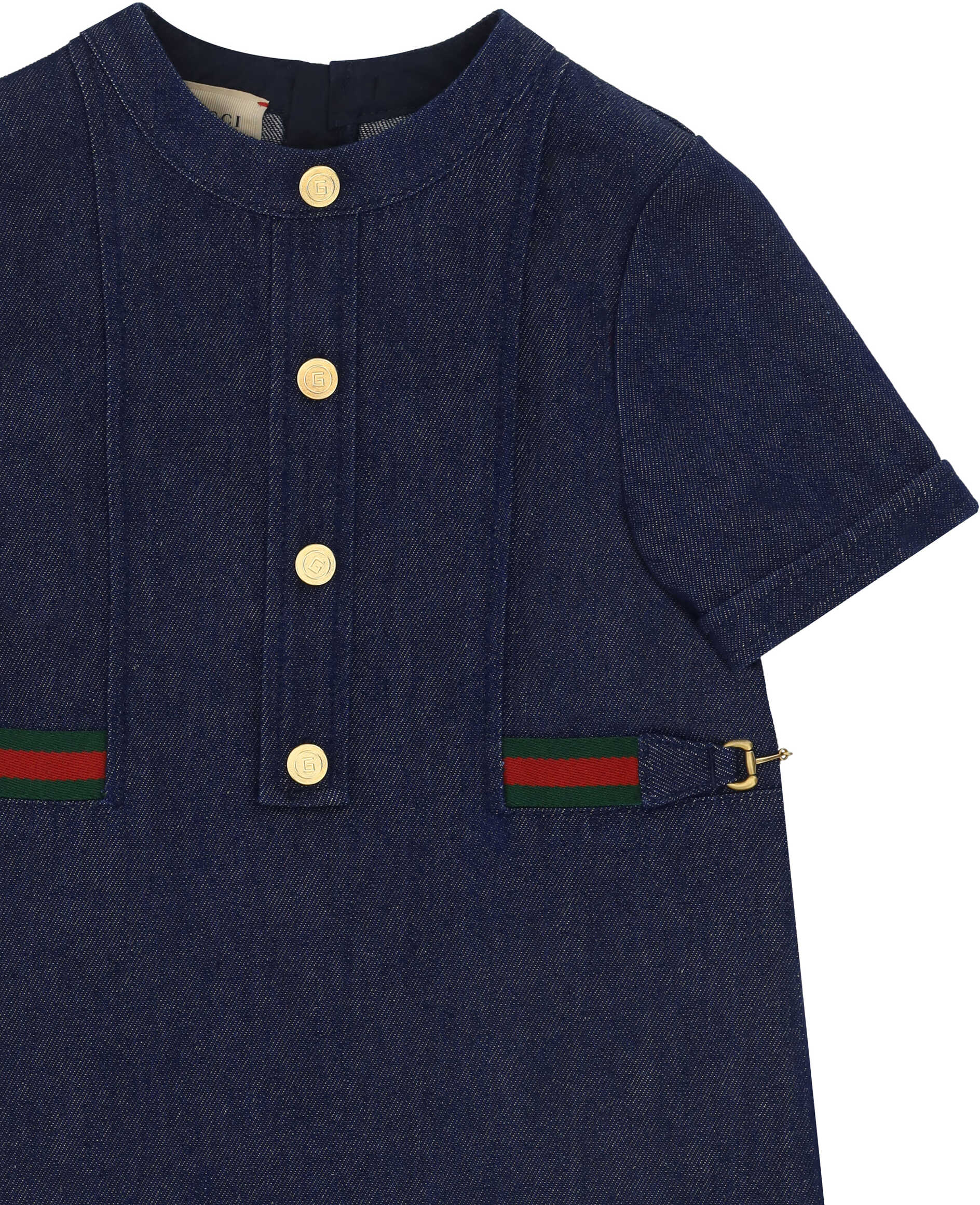 Cotton Dress for Girl by Gucci, denim design, short sleeves, front buttons, back zipper closure, iconic brand Clamps applied waistband.