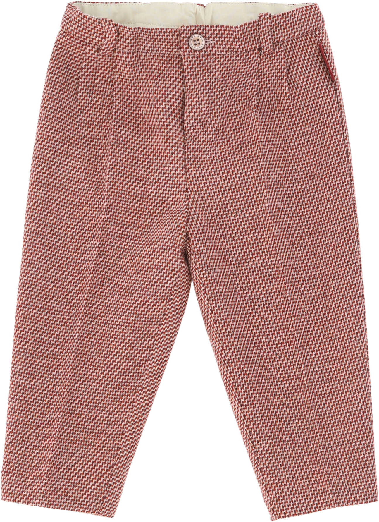 Cotton Fancy Pants for Boy by Gucci, Gabardine fabric design, button applique at elastic waistband, two side slash pockets, one patch flap pocket on back, checked pattern.