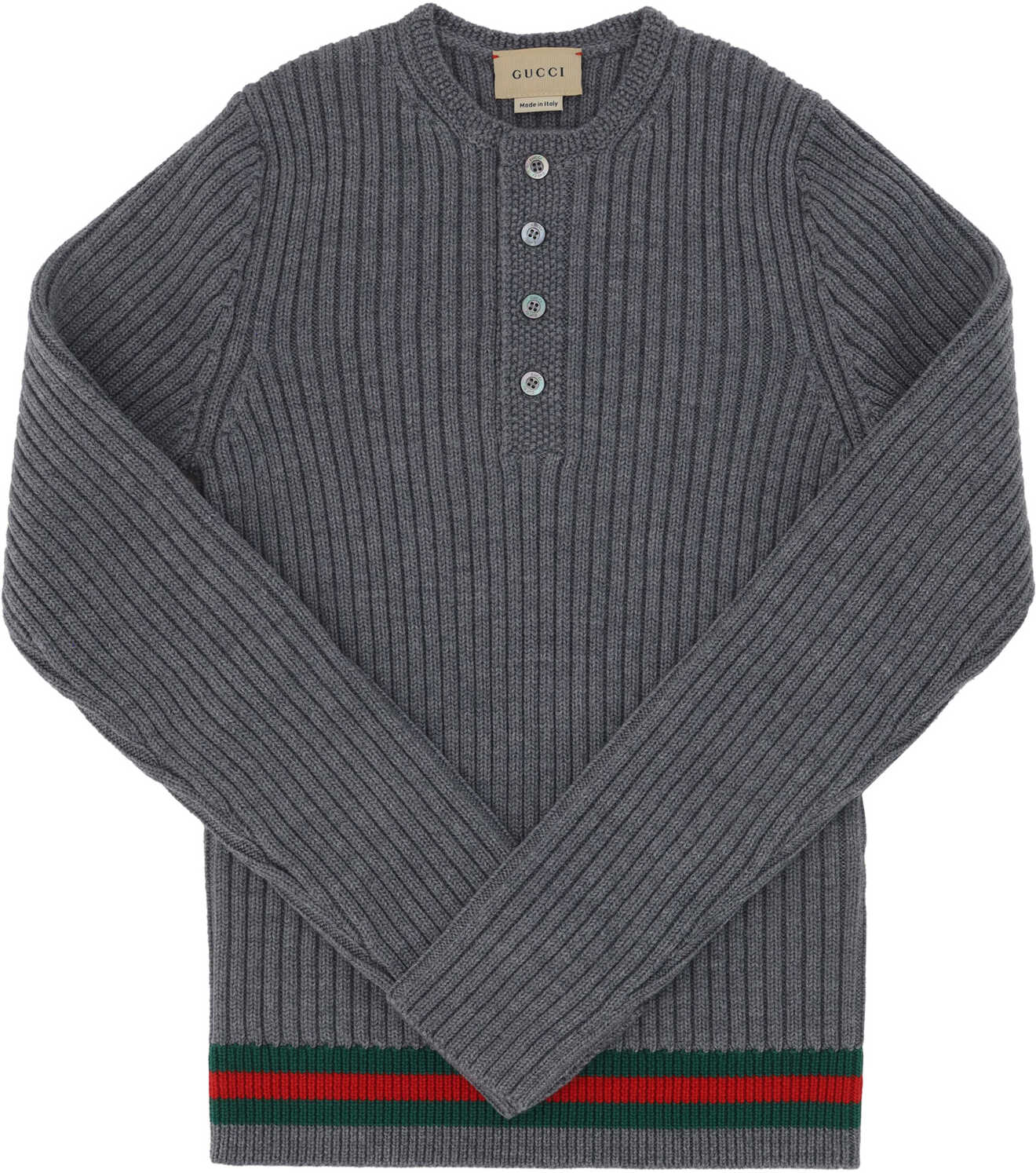 Sweater for Boy by Gucci, all-over ribbed design, front closure by contrasting buttons, webing bands with iconic brand colors on hem.