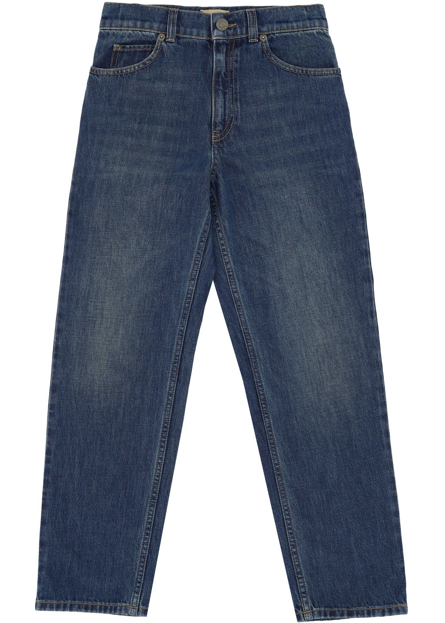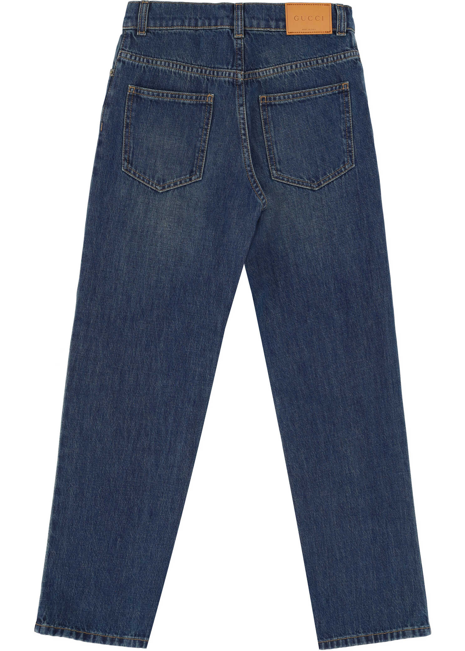 Cotton Jeans for Boy by Gucci, button and zipper front closure, five-pocket design, waistband loops, iconic leather patch with signature brand pressure print applied at back.