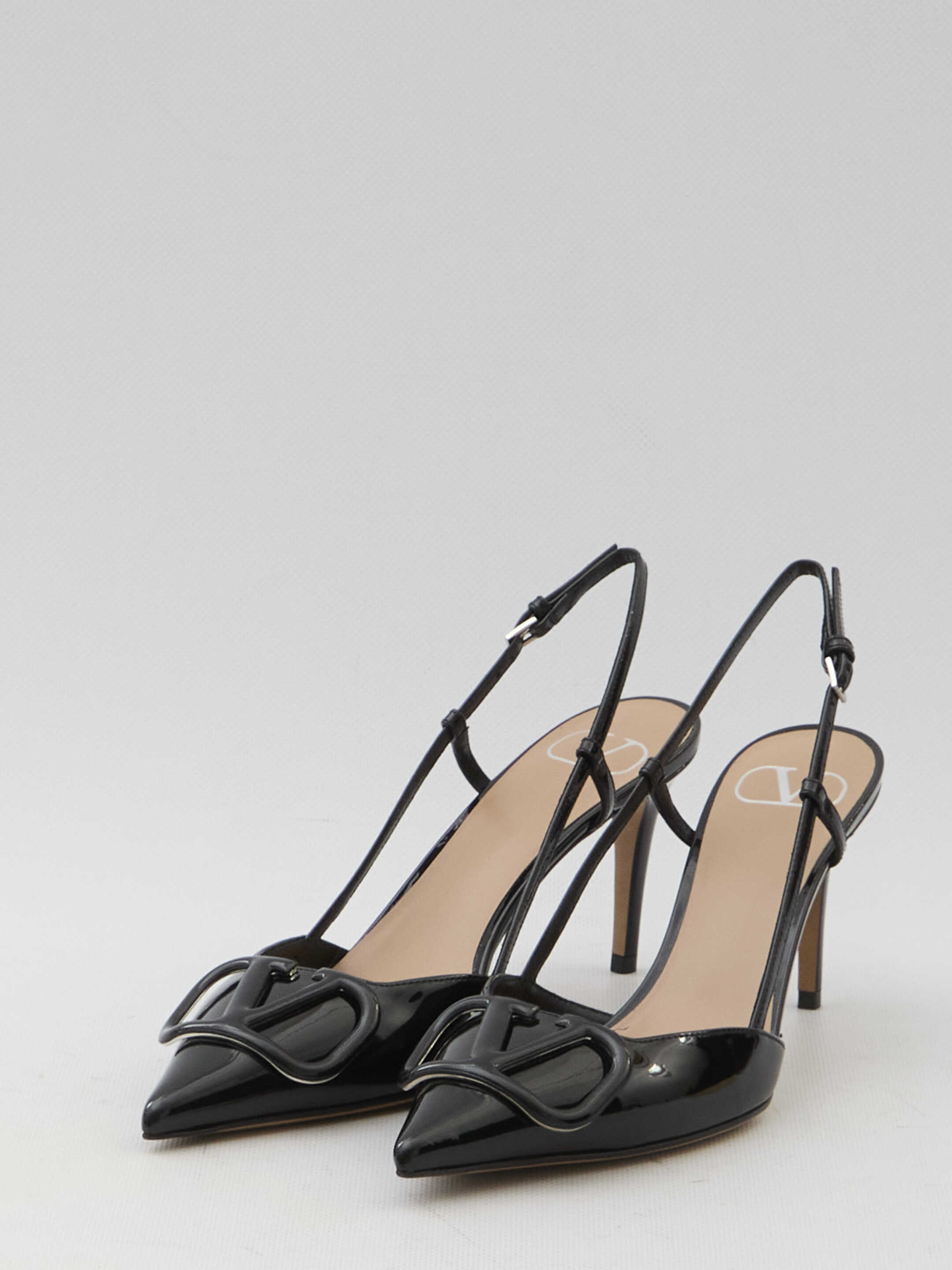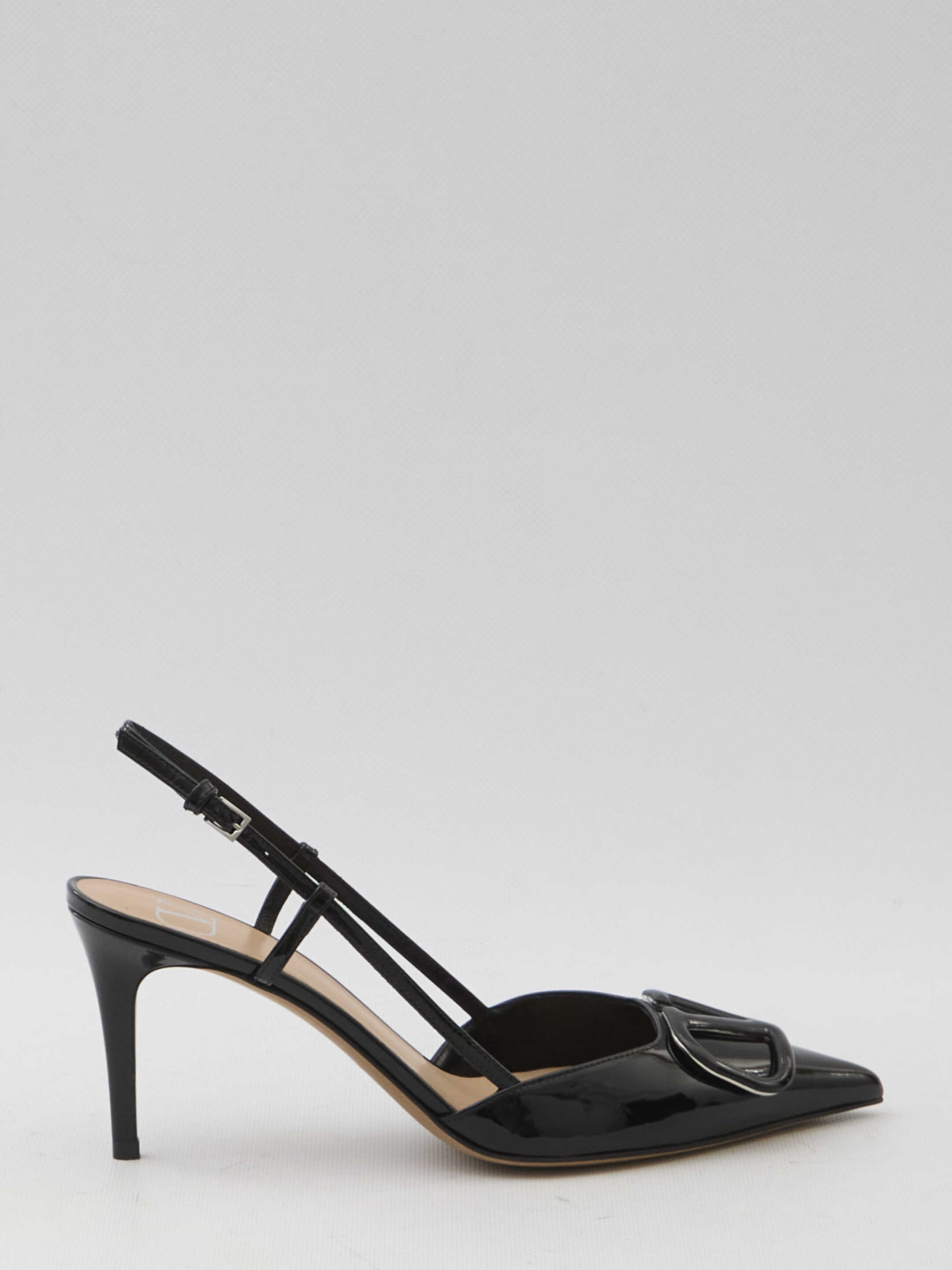 Valentino Garavani slingback pumps in black patent leather with tone-on-tone VLogo Signature embellishment. They feature pointed toe, adjustable ankle strap, thin heel and leather sole. Dust bag included. Any leather imperfections are not to be considered manufacturing defects, but a peculiarity of the material.