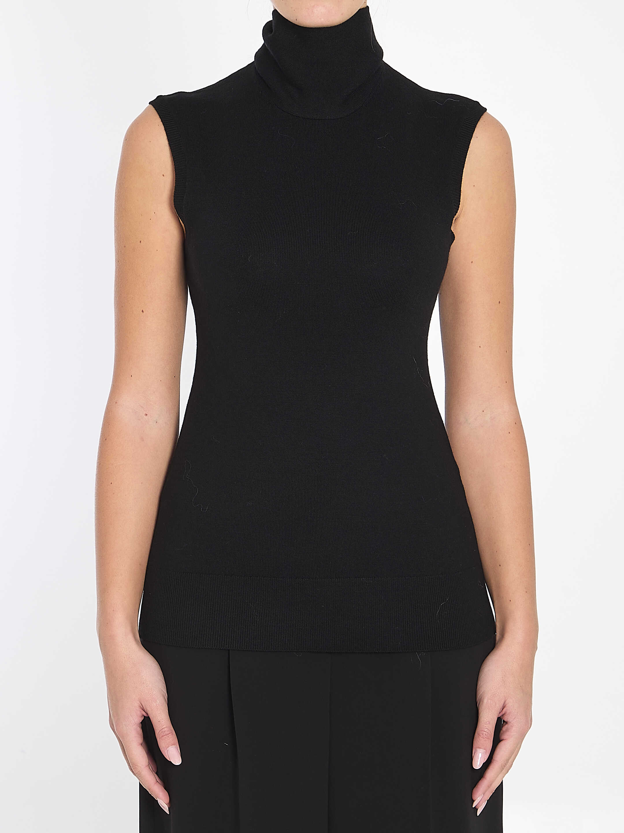 Sleeveless jumper in black merino wool blend with slim scarf attached to the neck. Slim fit.
