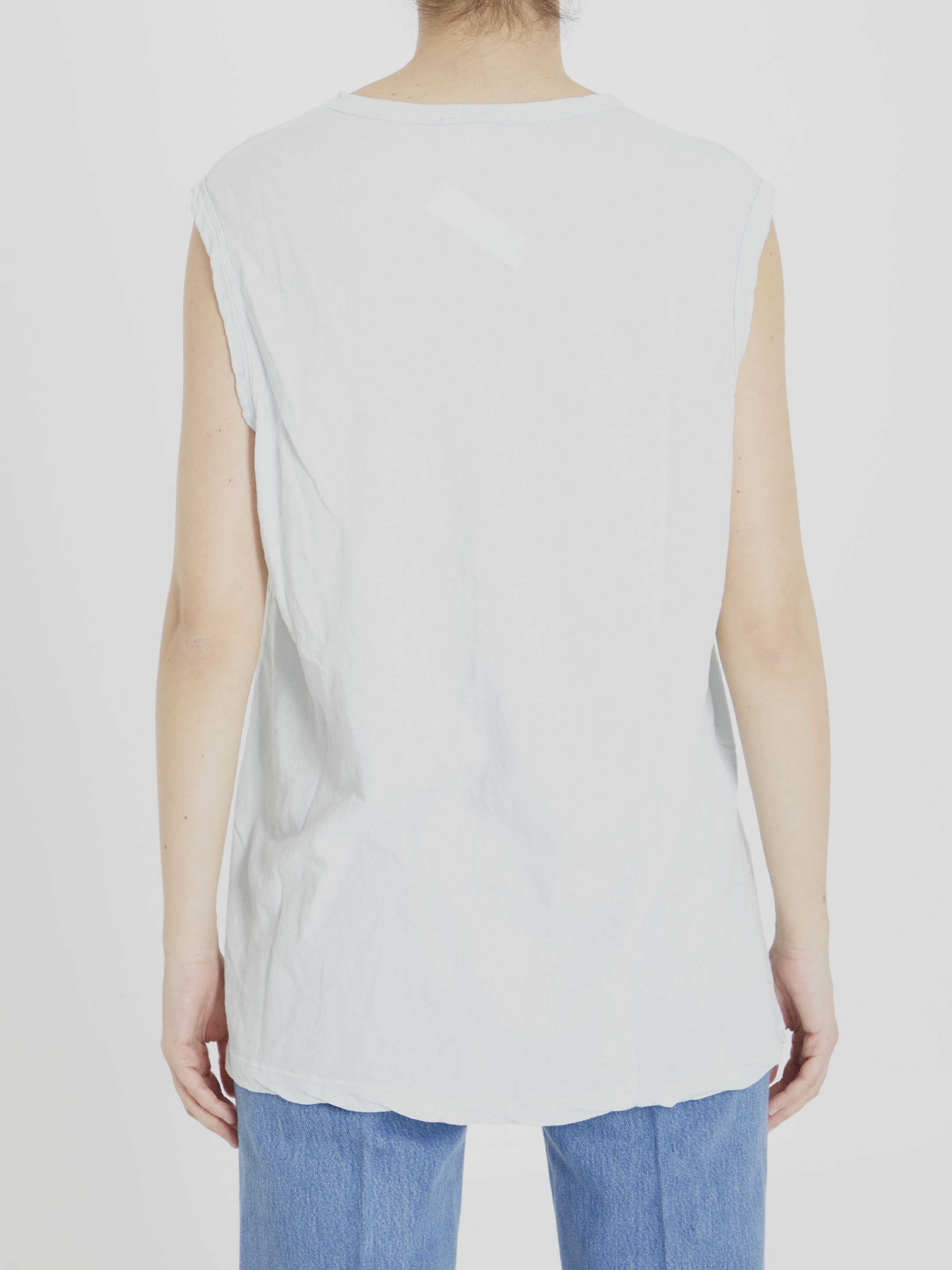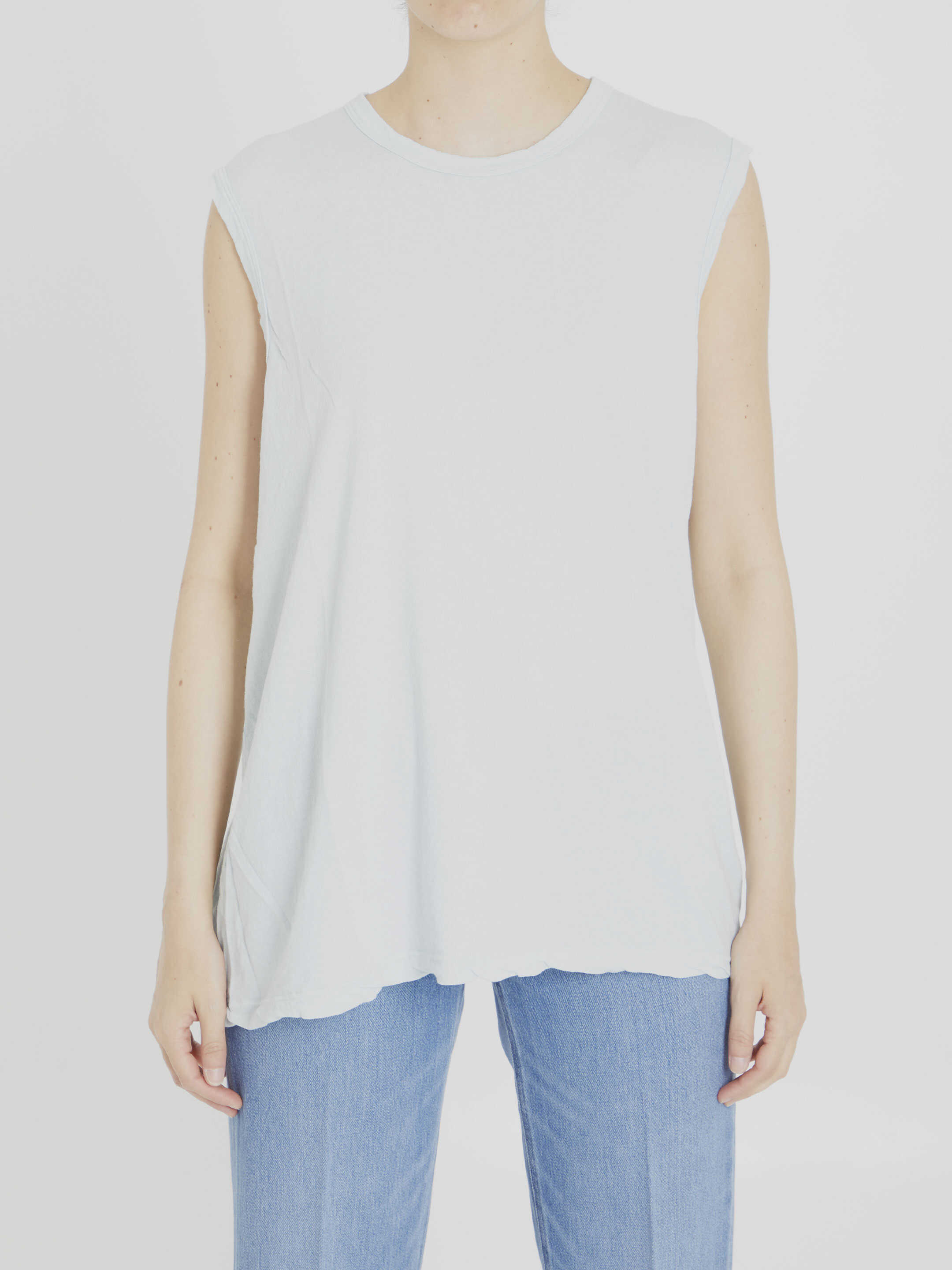 Sleeveless crewneck t-shirt in turquoise cotton. Crinkled edges.