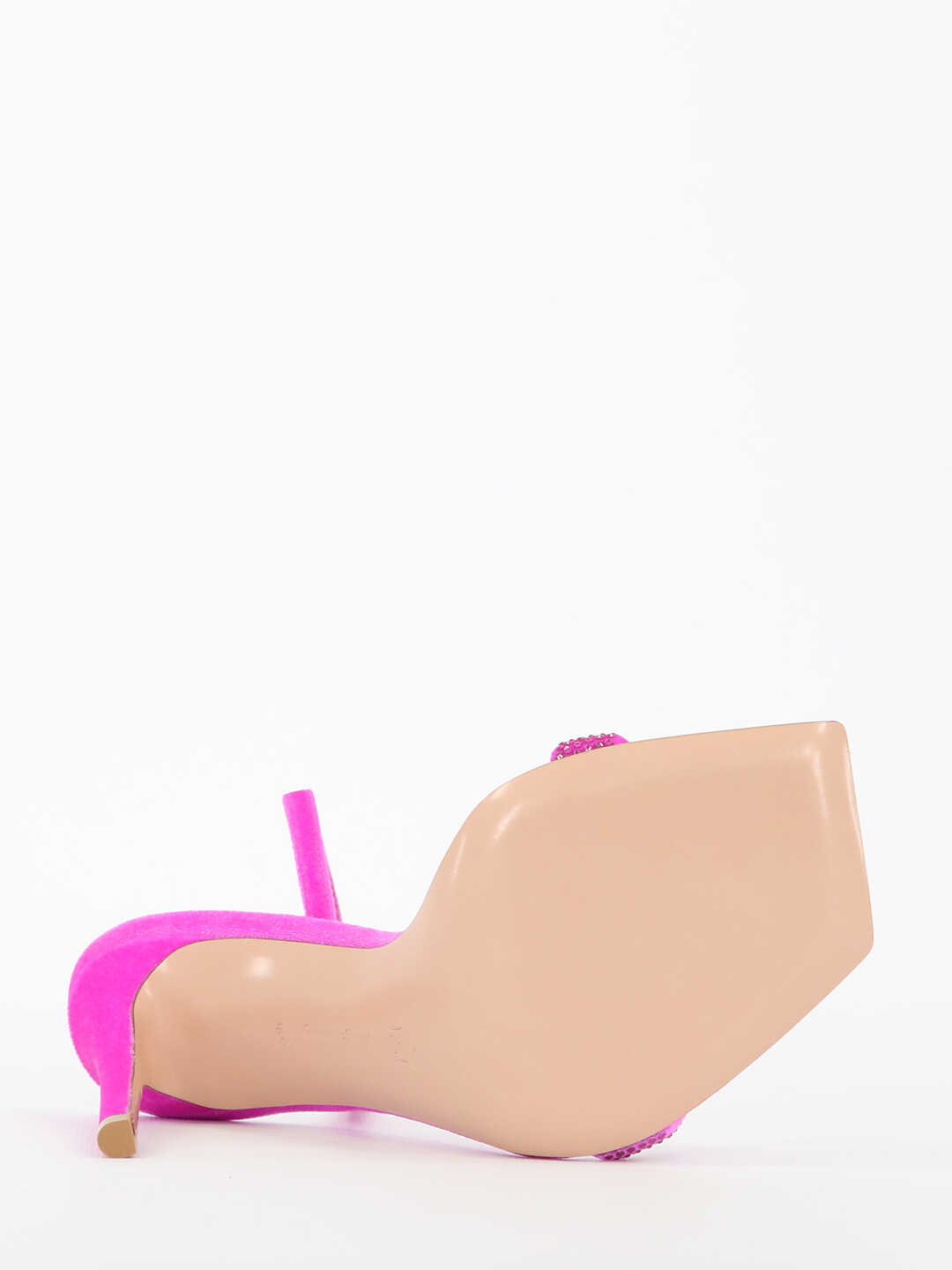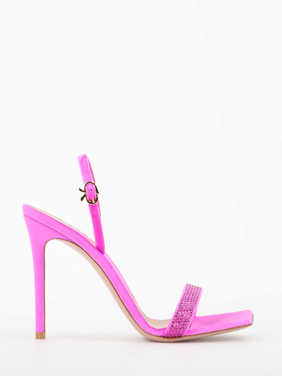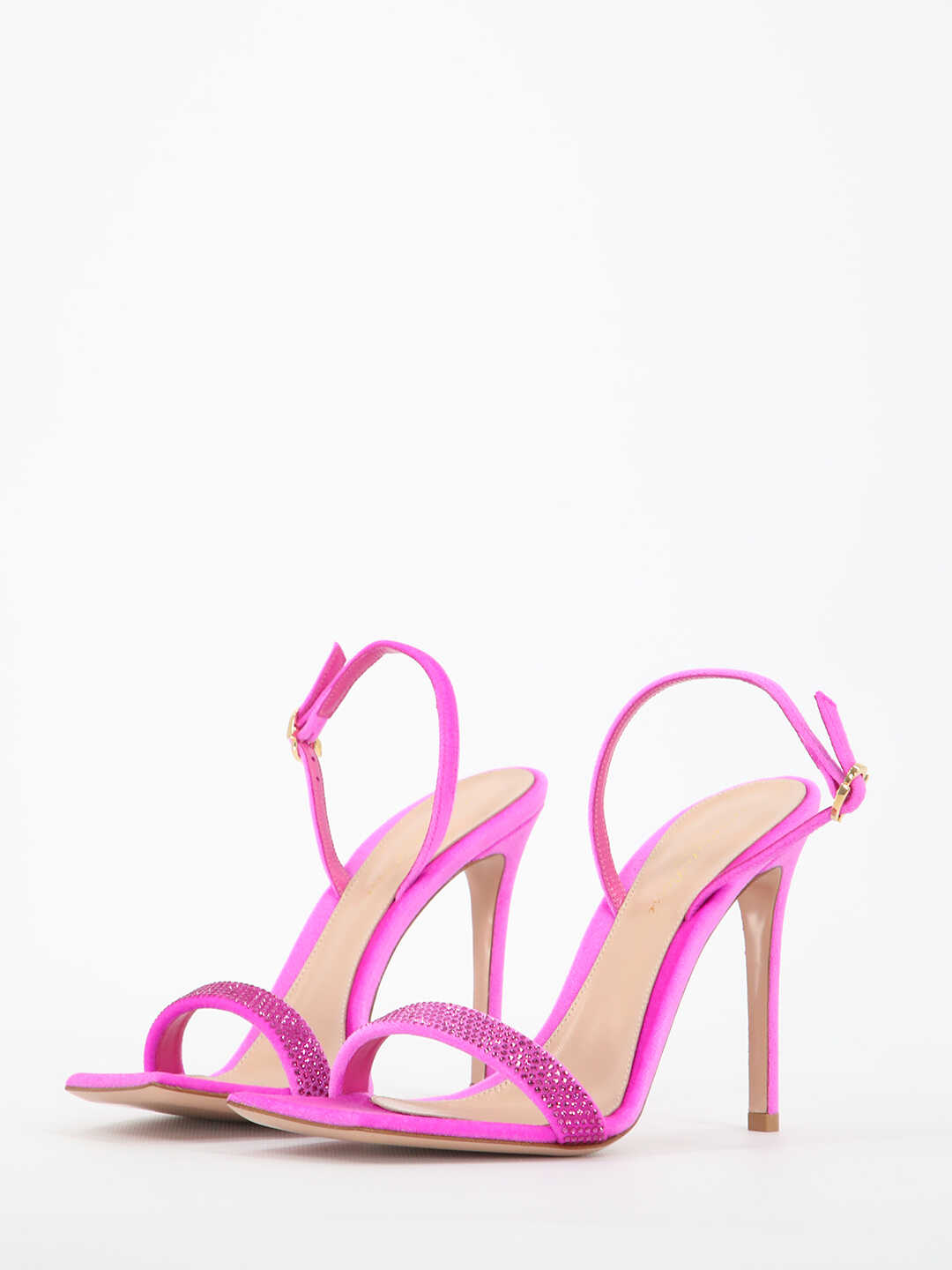 Britney sandals in fuchsia velvet with strass band. They feature adjustable ankle strap with buckle, stiletto heel, leather insole with Gianvito Rossi logo and square and open toe.