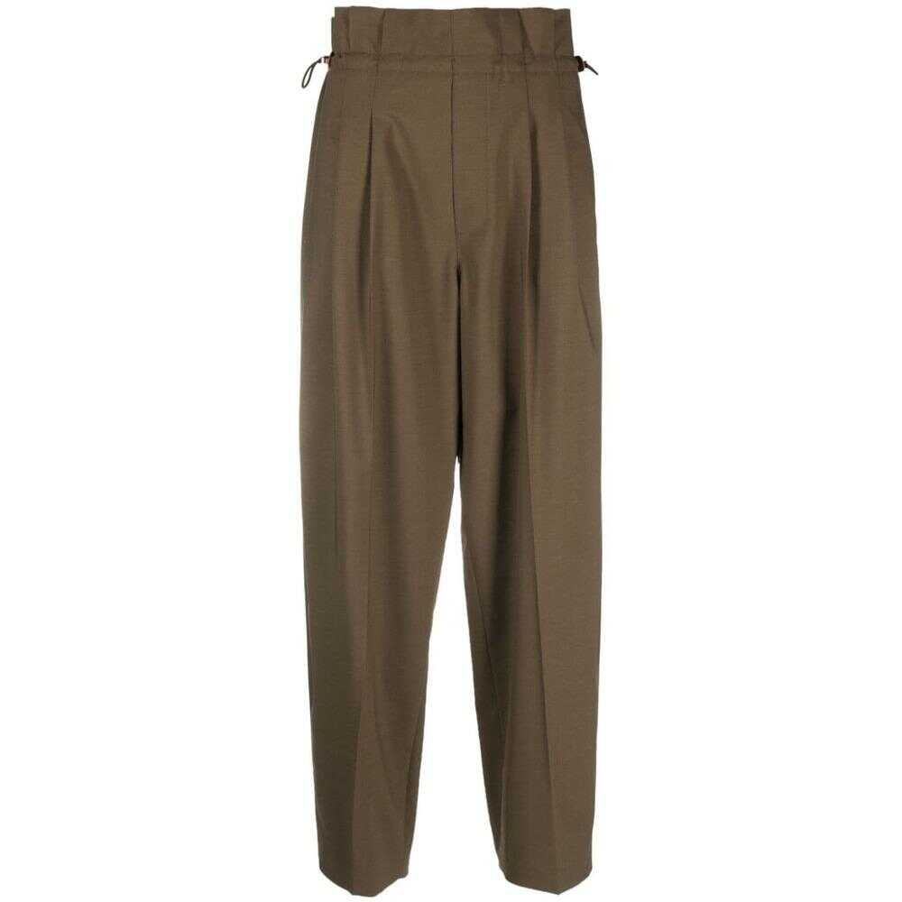 Olive green paperbag waist elasticated drawstring waistband concealed front zip fastening two side inset pockets pleat detailing pressed crease wide leg