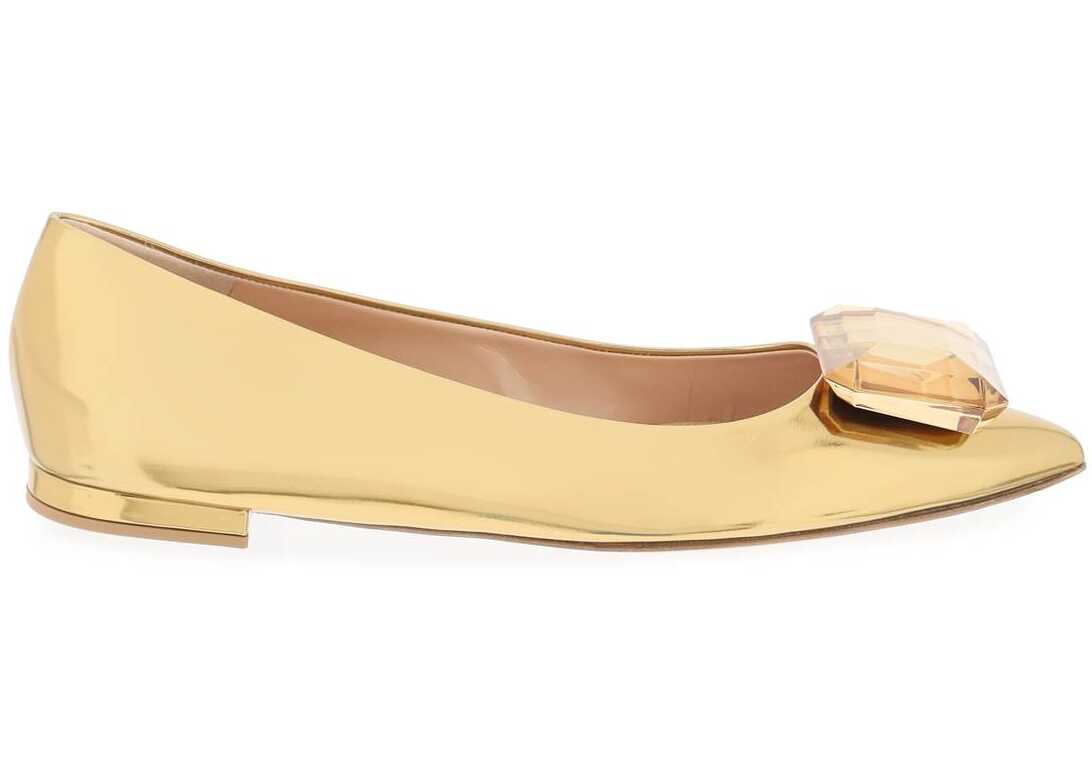 The Jaupir 05 ballerina flats by Gianvito Rossi are made of laminated leather with a large emerald-cut gemstone applied on the toe. The interior is lined with leather and the sole is made of leather as well.