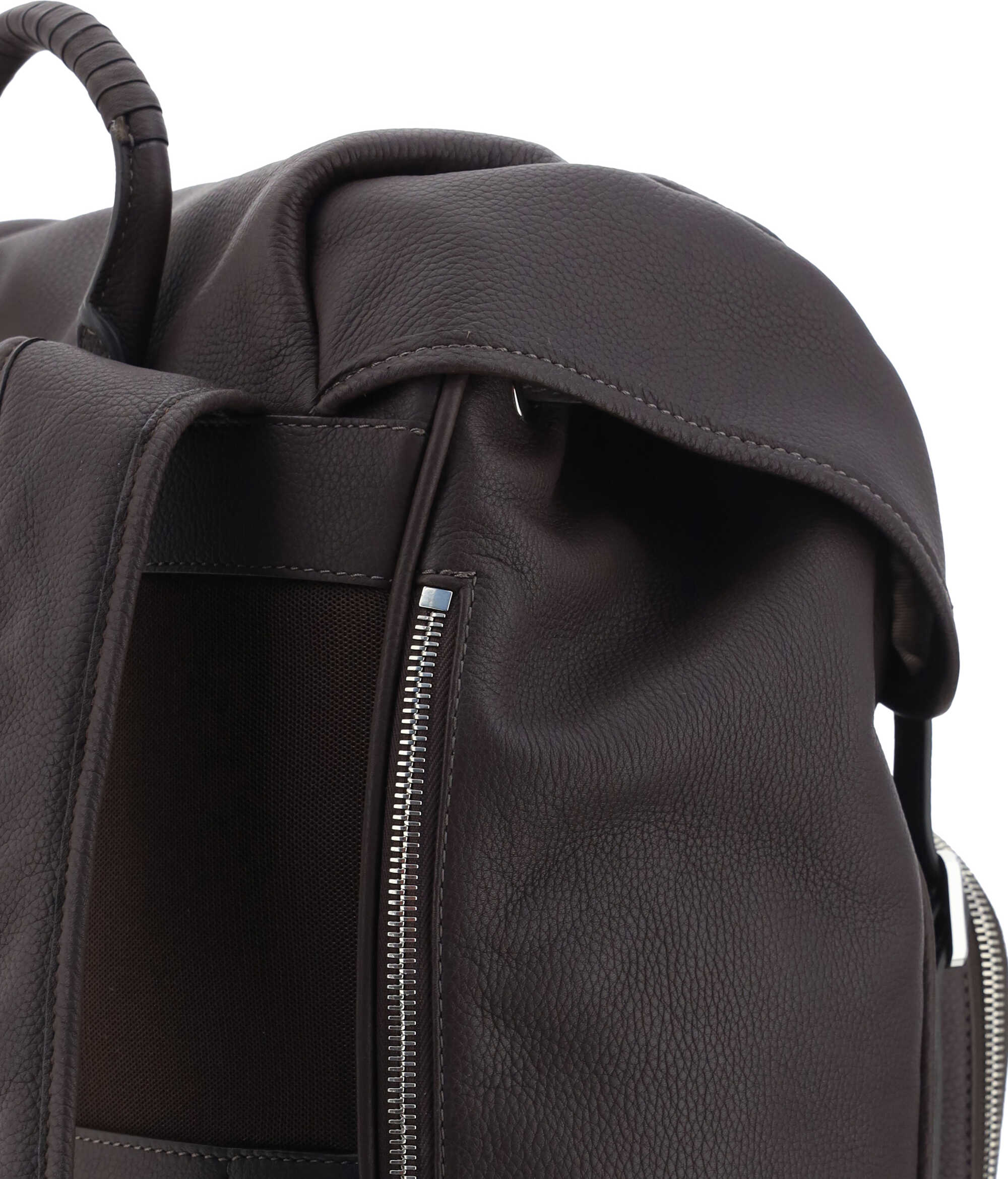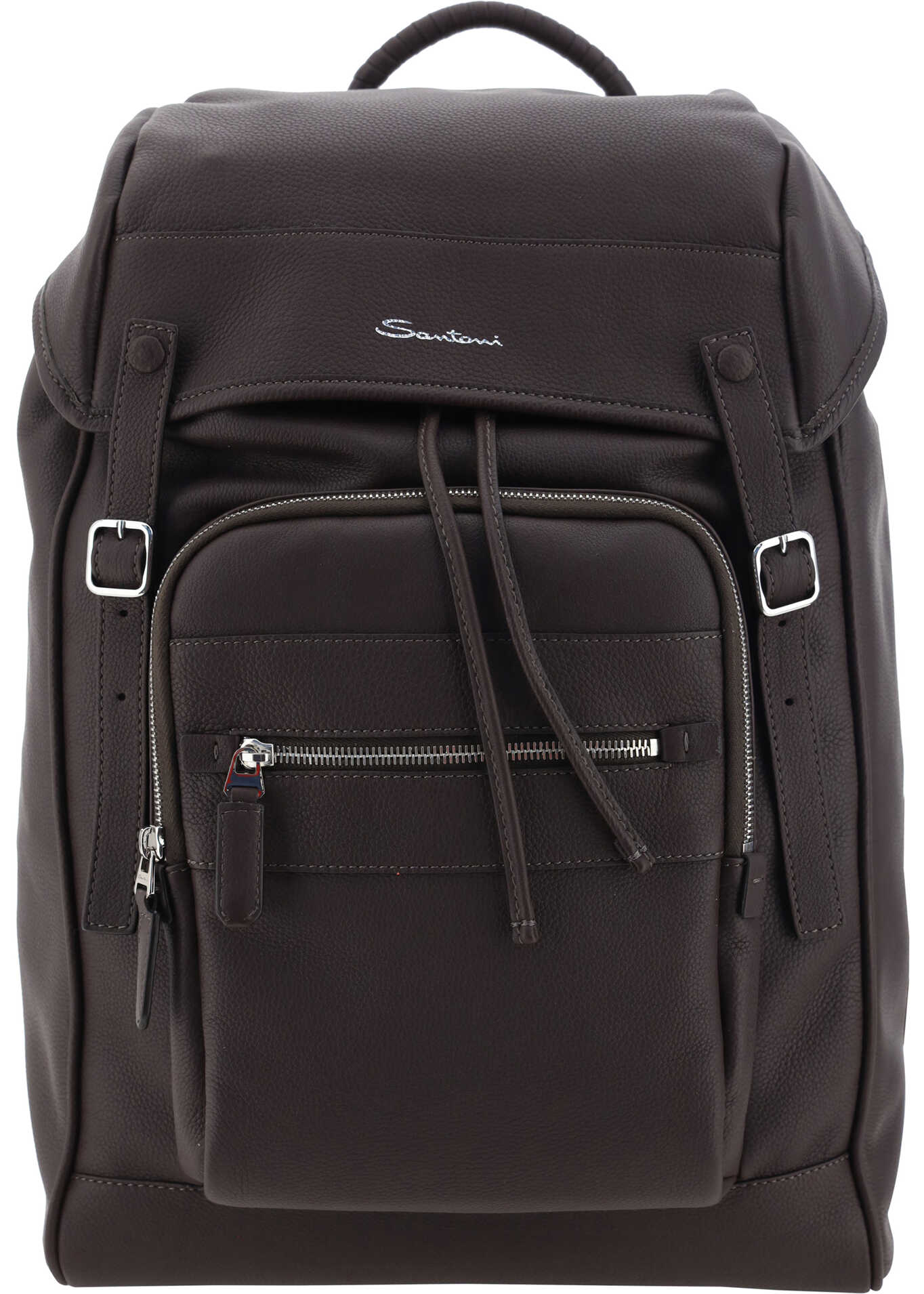 Leather Backpack by Santoni, grained leather design, padded and adjustable shoulder straps, double metal buckle appliqué on front for closure, flap closure, zippered welt pocket on side panel, maxi slit pocket appliqué on front with lap zipper for closure, zippered welt pocket on front, stiff top handle, single interior zippered pocket, iconic brand monogram printed in contrast on front.