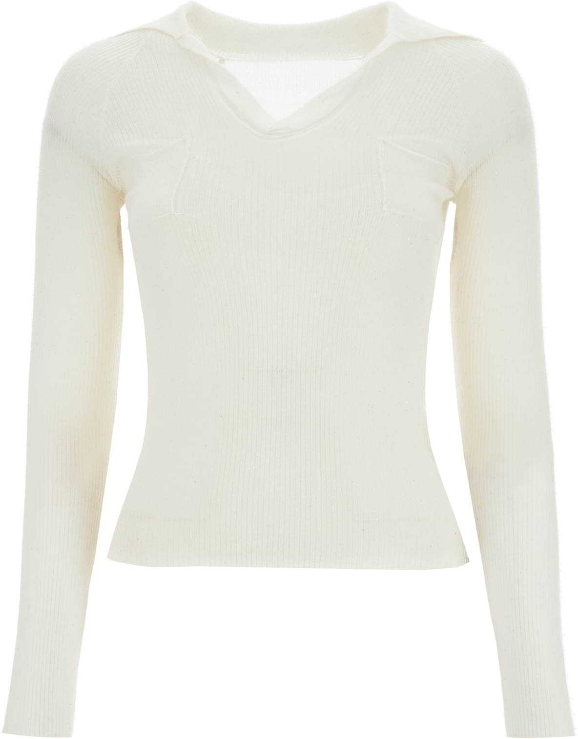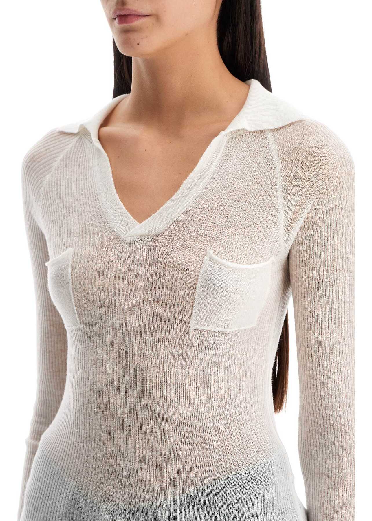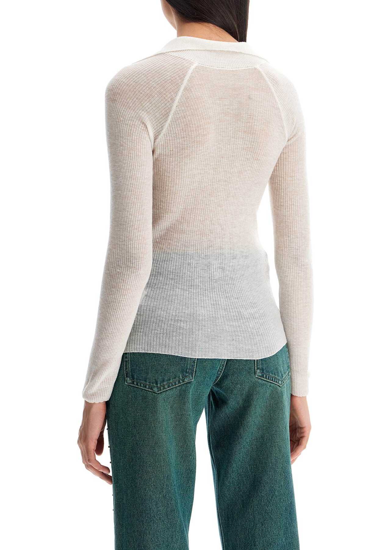 Illuminated by micro sequins, this Paloma Wool top is made of a lightweight ribbed merino wool fabric that is mulesing-free. It features a fitted silhouette with raglan sleeves, two chest pockets, and a V-neckline with a collar. The model is 177 cm tall and wears size XS.