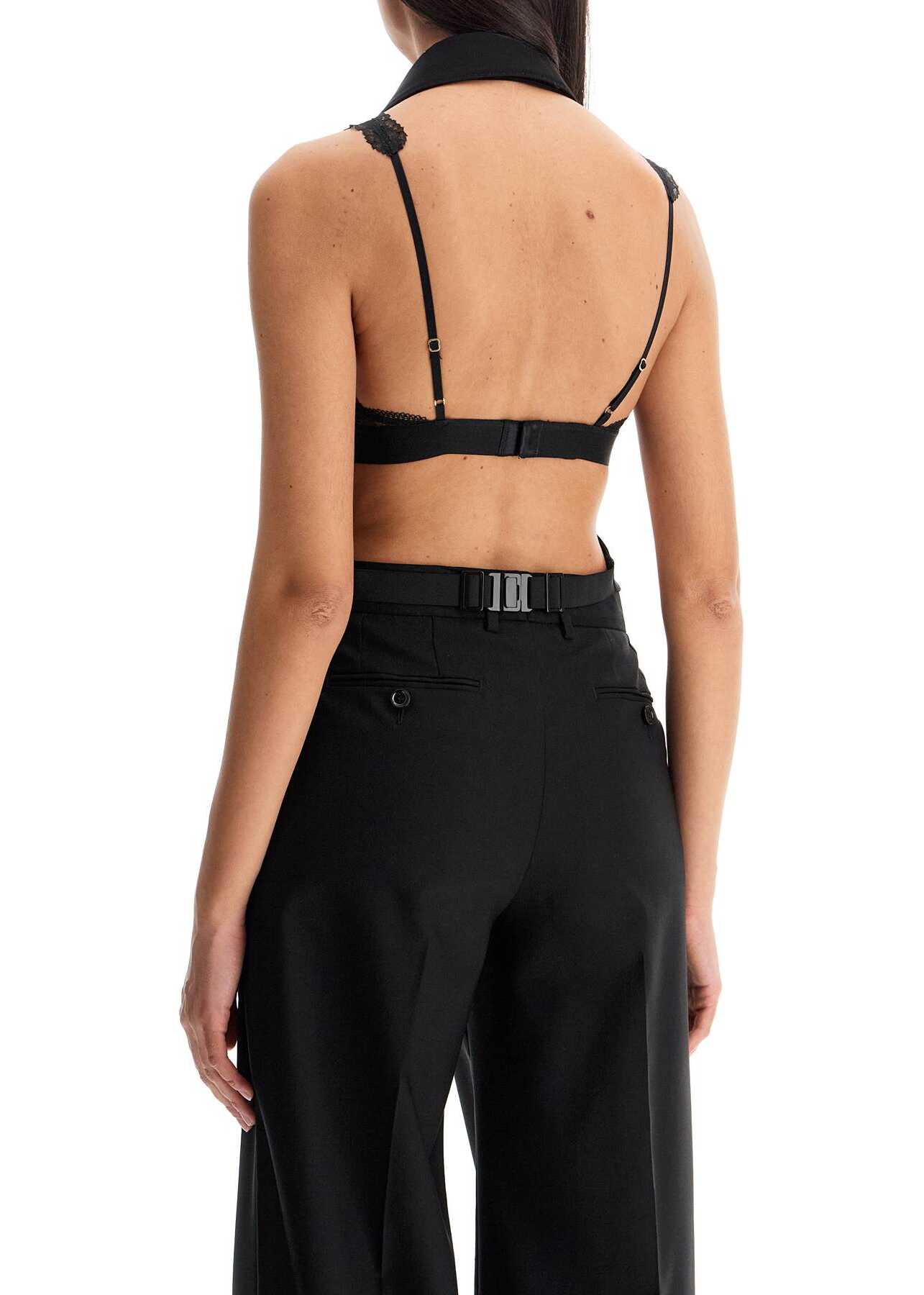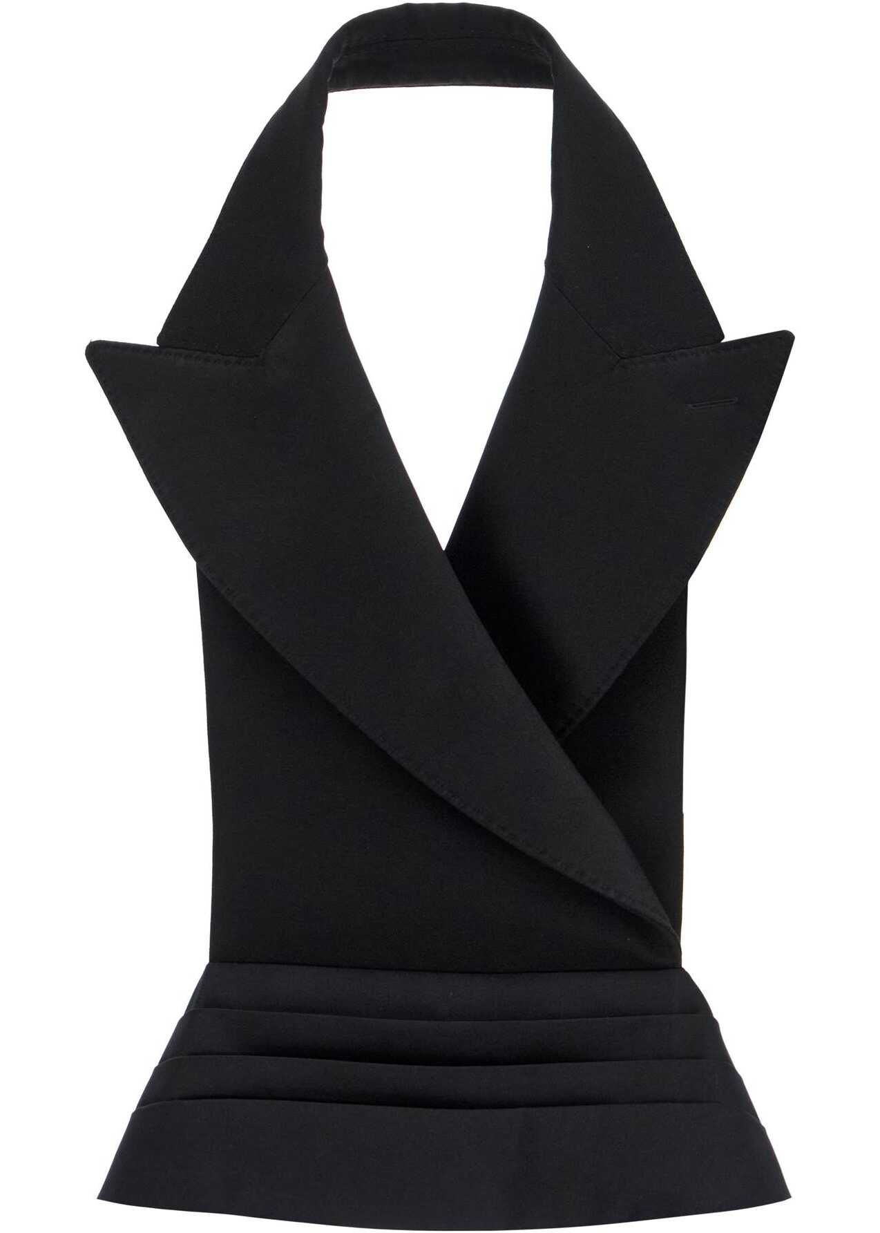 This Dolce & Gabbana double-breasted vest is characterized by an open back design. Made of virgin wool gabardine and silk satin, it features a halter neckline with wide peak lapels and a pleated waistband. The elastic adjustable strap on the back has a buckle closure. The model is 177 cm tall and wears size IT 40.