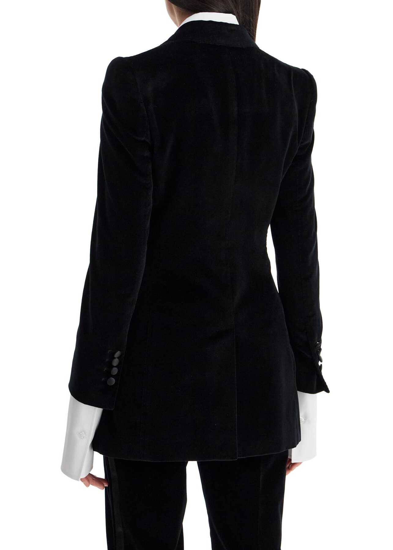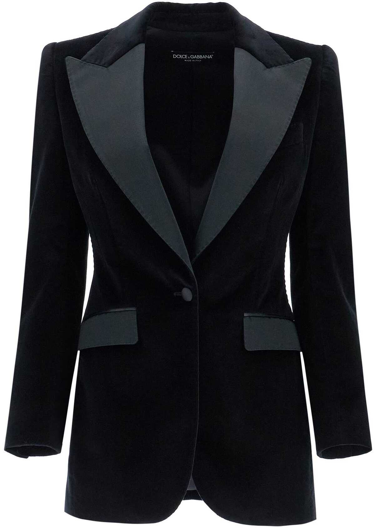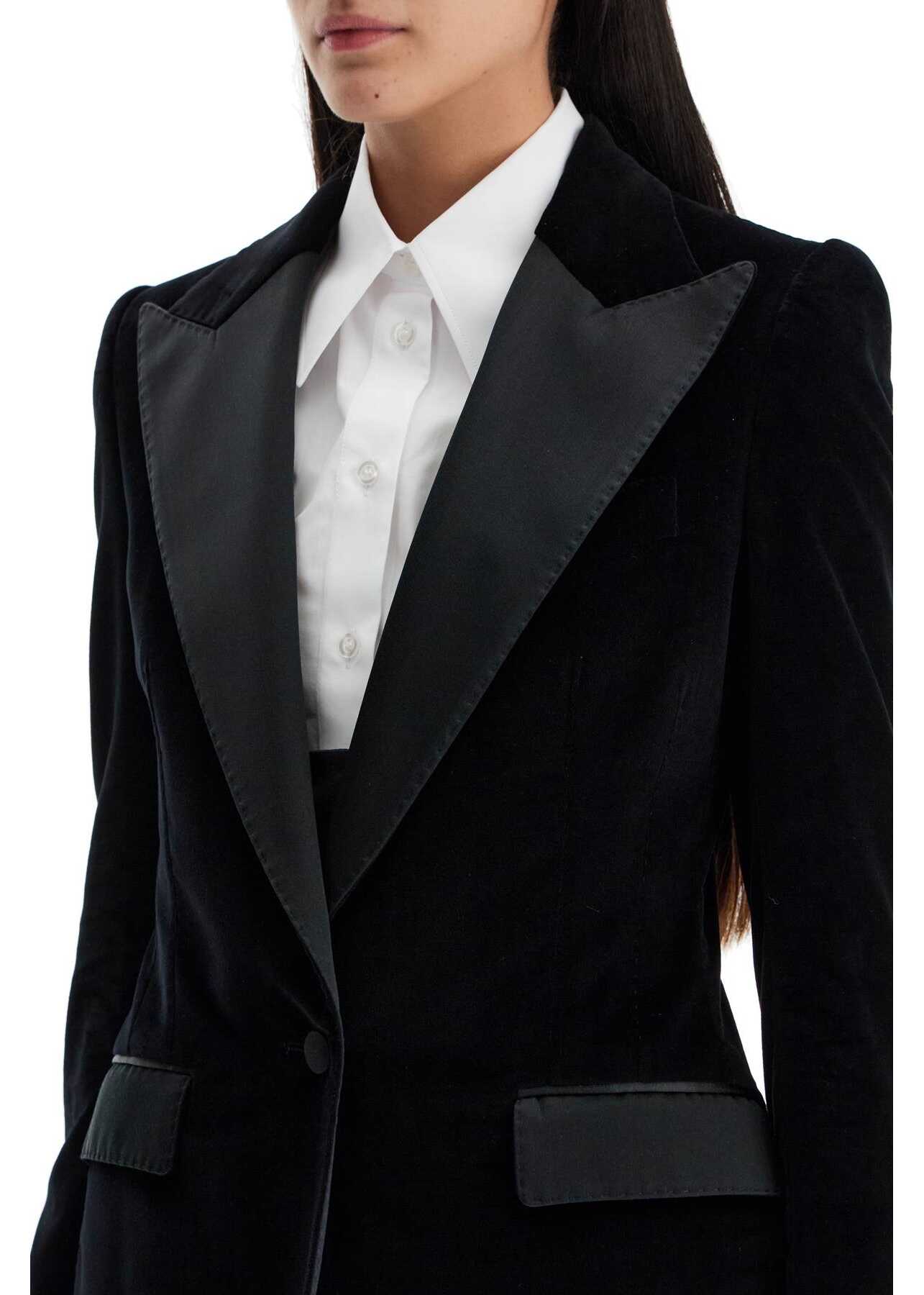Dolce & Gabbana presents a tuxedo version of the Turlington jacket, made from soft velvet with tonal satin finishes. The fitted silhouette with structured shoulders features a single-breasted design with a wide peak lapel, two flap pockets, a chest pocket, and a central slit at the back. Lined in pure silk satin. The model is 177 cm tall and wears an Italian size 40.