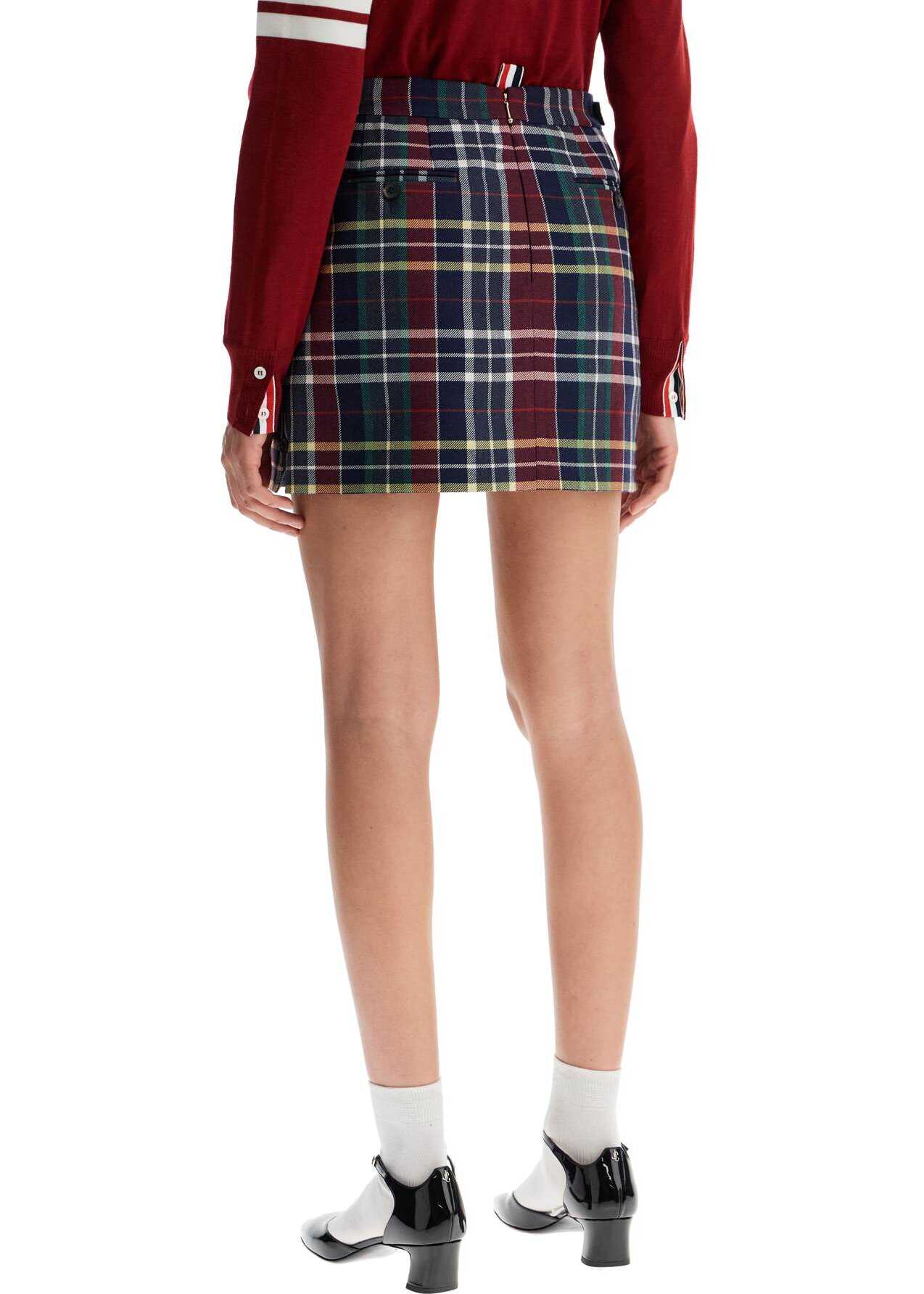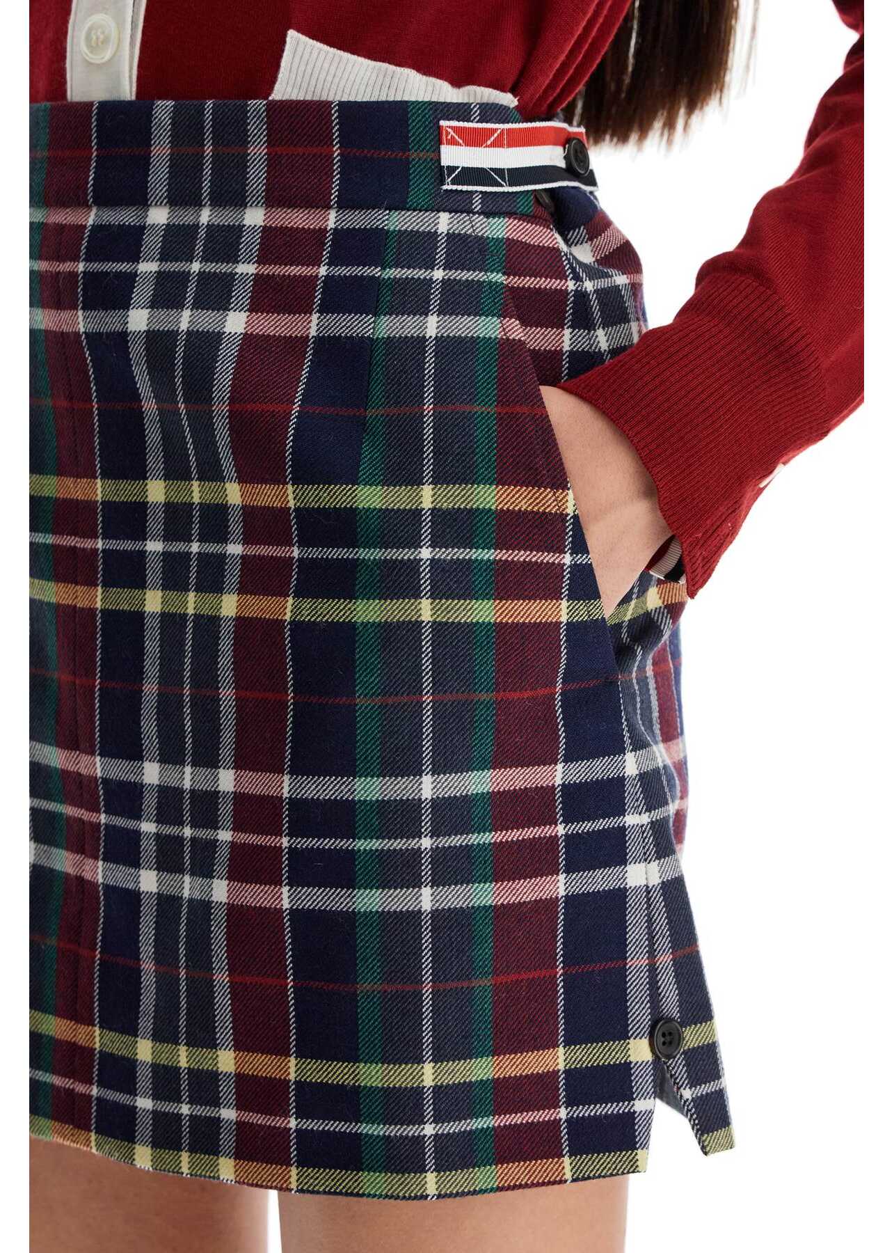 This Thom Browne miniskirt is made of wool twill with a tartan pattern and adorned with classic tricolor grosgrain ribbons on the sides. It features a back zip closure, side slits with decorative buttons, and welt pockets with a button detail on the back.