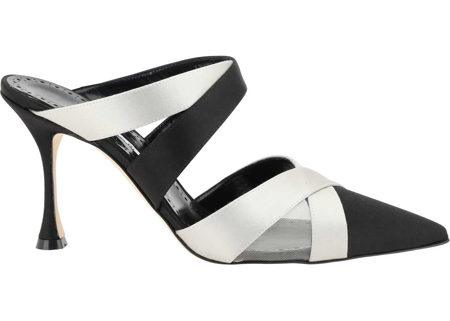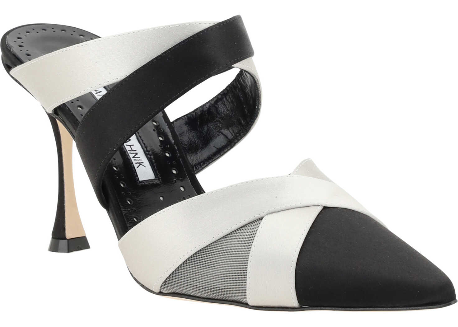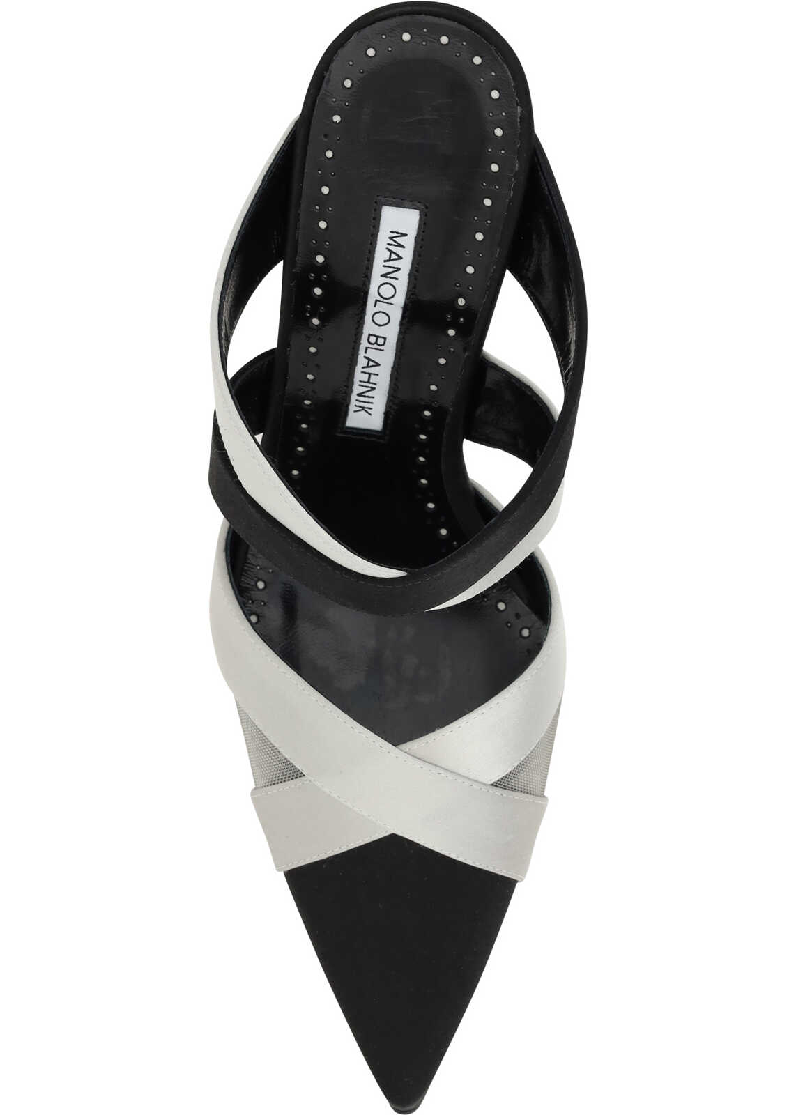 Satin Oyounak Pumps by Manolo Blahnik, elongated toe with mesh detailing on side panels, wide braided band at back of foot, leather stiletto heel, logoed insole.