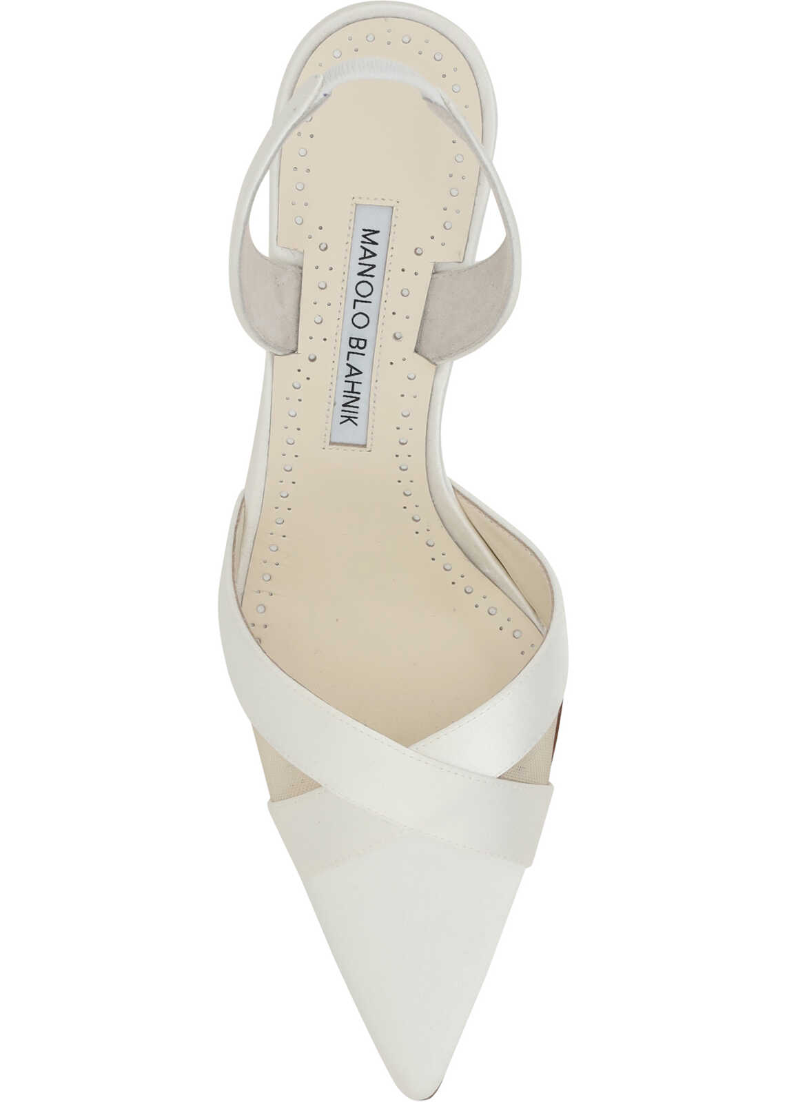 Satin Oyounak Pumps by Manolo Blahnik featuring an elongated toe with mesh detailing on side panels, an elasticized slingback, a leather stiletto heel, and a logo-embossed insole.