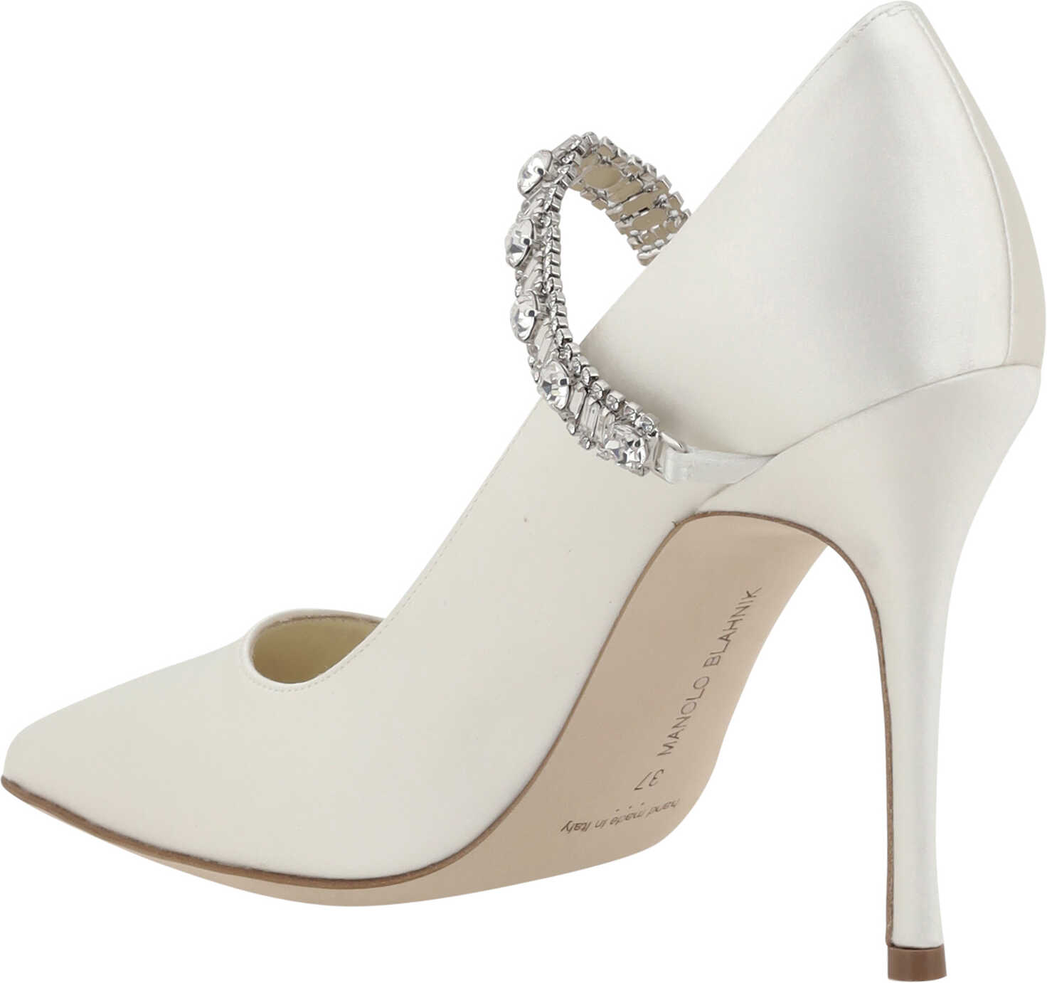 Manolo Blahnik's Hamedi Silk Satin Pumps are the epitome of elegance and luxury. Characterized by an elongated toe that slims the silhouette, these pumps feature an adjustable buckle strap, decorated with shimmering jewels applied across the surface for a glittering effect. The leather stiletto heel adds height and sophistication, while the branded insole completes the design with a distinctive touch. Perfect for special occasions, these pumps combine comfort and glamour in a sophisticated way.