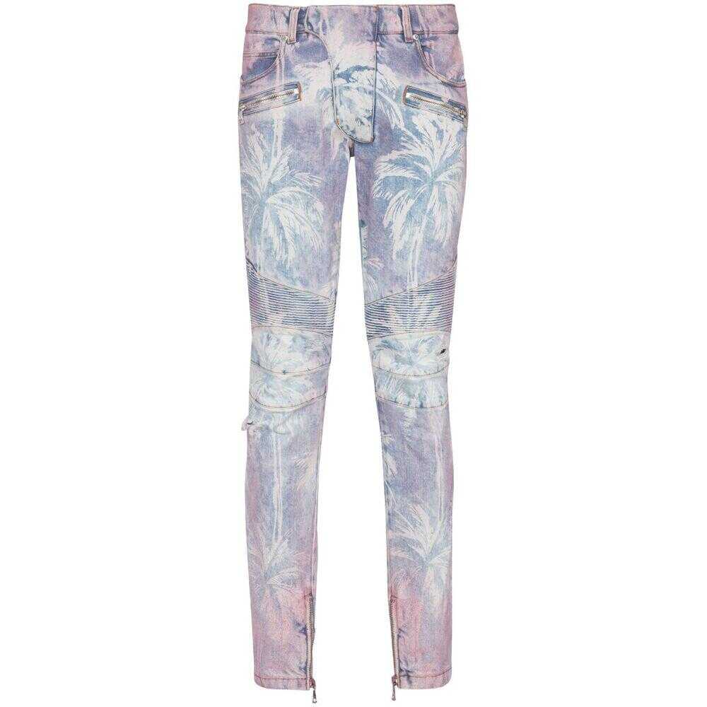 Light blue/light pink stretch-cotton washed denim palm tree print panelled design ribbed panelling logo patch to the rear ripped detailing contrast stitching skinny cut mid-rise concealed front fastening belt loops classic five pockets two side zip-fastening pockets ankle zips