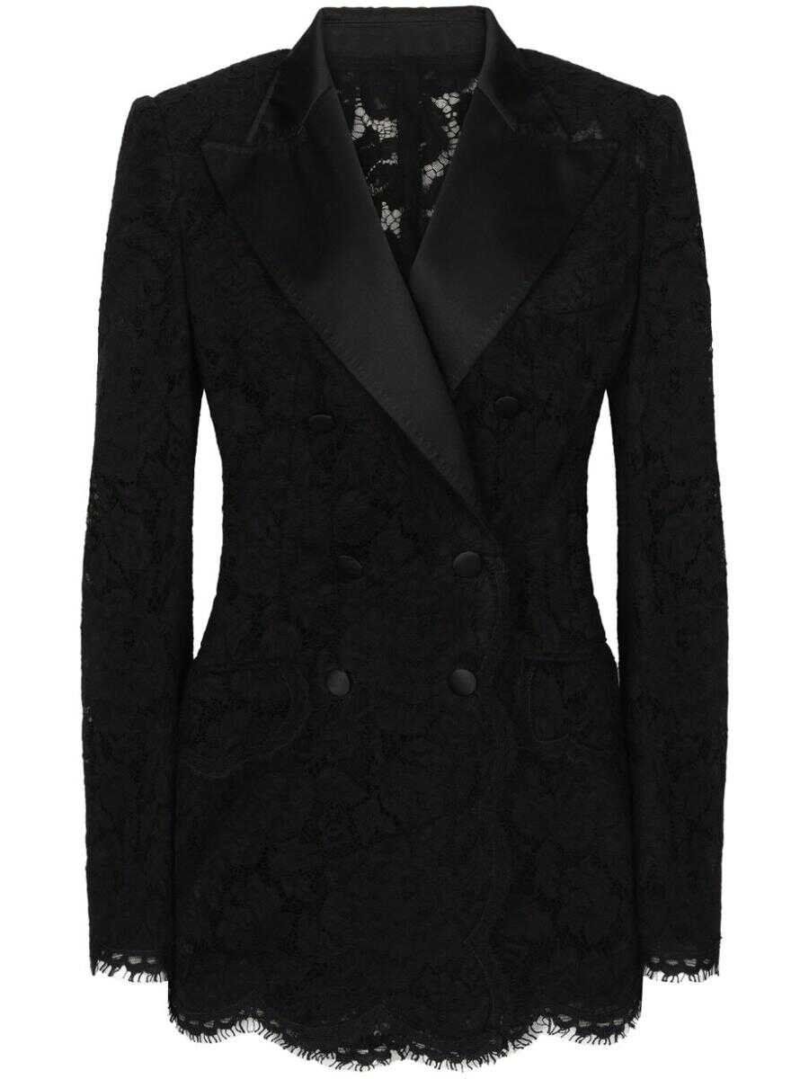 black V-neck floral-lace detailing double-breasted button fastening long sleeves straight hem