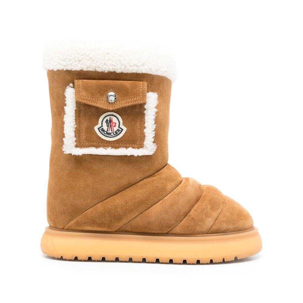 Camel brown calf suede shearling trim padded design quilted slip-on style mid-calf length logo patch to the side side flap pocket round toe branded insole full lining chunky rubber lug sole this piece comes complete with a protective dust bag.