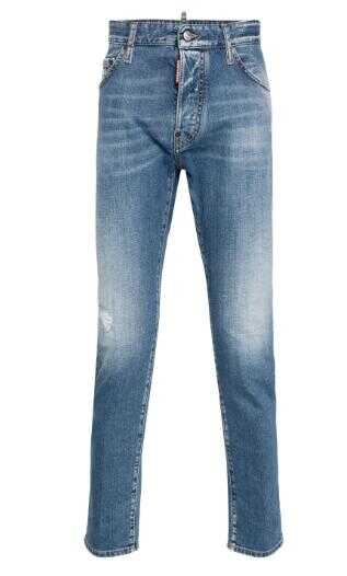 light blue stretch-cotton mid wash faded effect whiskering effect at the thighs ripped detailing mid-rise belt loops mini logo tag classic five pockets logo patch to the rear slim cut button fly fastening