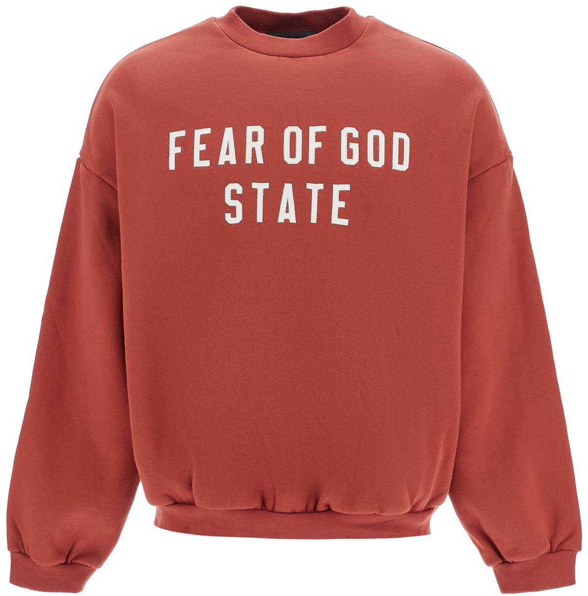 The Fear Of God Essentials crewneck sweatshirt is made of heavy cotton jersey with a soft brushed interior and an embroidered logo on the front. It has an oversized fit with side pockets and stretch ribbed finishes on the edges. The model is 182 cm tall and wears size M.