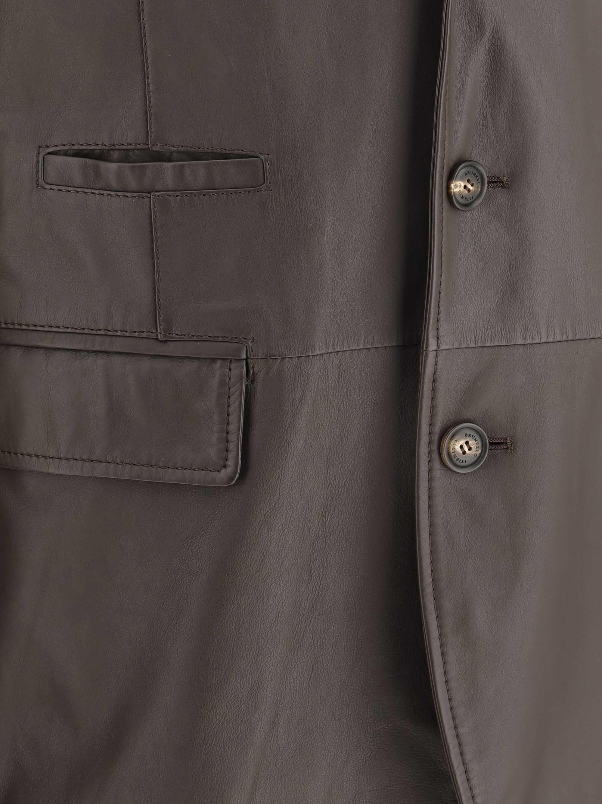Leather Jacket by Brunello Cucinelli, blazer style, classic lapels, front button closure, two flap pockets on front, two slit pockets on front panel, two slits on back, regular fit.