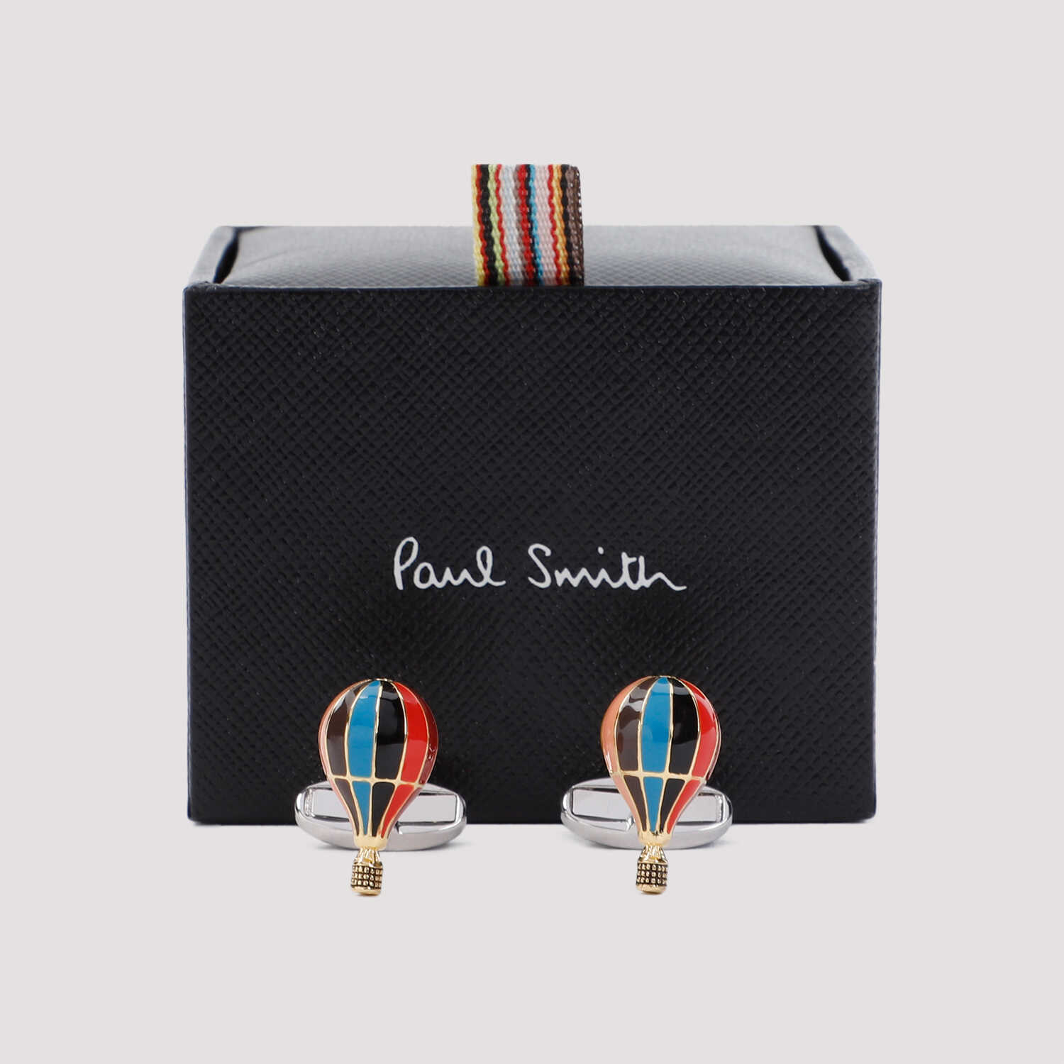 Elevate your style with this exquisite Paul Smith metallic cufflink. Crafted from a blend of 70% copper and 30% zinc, this air balloon-shaped accessory features enameled multicolor stripes and an engraved logo at the back. Perfect for adding a touch of sophistication to any formal outfit.