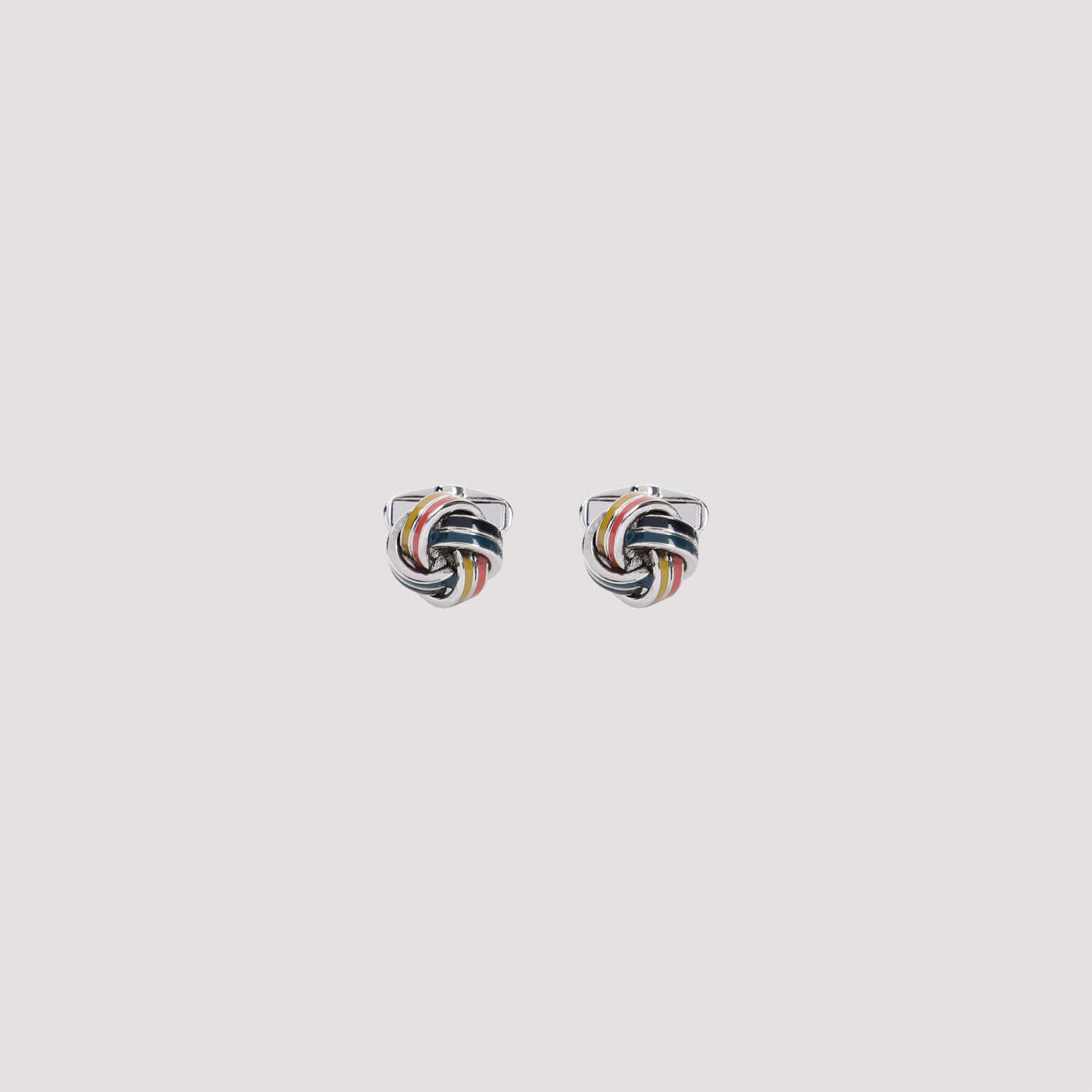 Elevate your style with these stunning metallic cufflinks from PAUL SMITH. Crafted from a blend of copper and zinc, these knot-shaped cufflinks feature enameled multicolor stripes and the brand's logo engraved at the back. Perfect for adding a pop of color and sophistication to any formal outfit. Stand out from the crowd with these unique and trendy accessories.