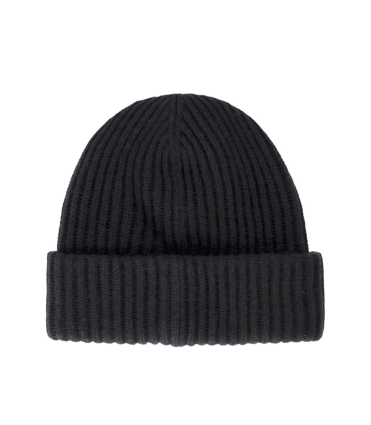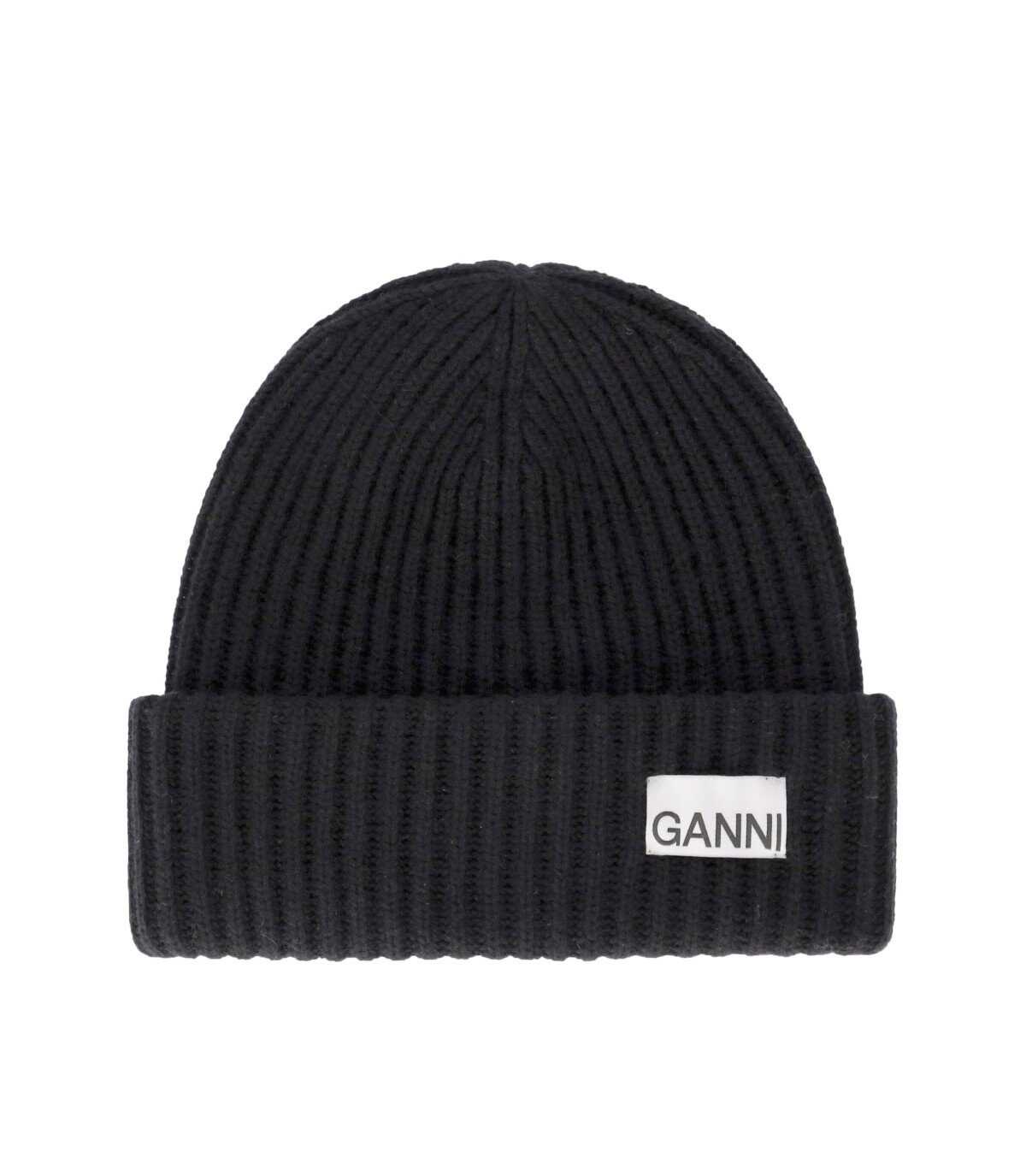 Ganni beanie made of black ribbed wool blend. Contrast logo patch.