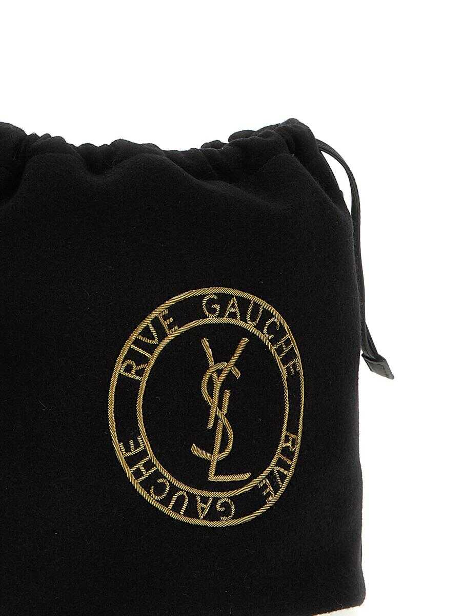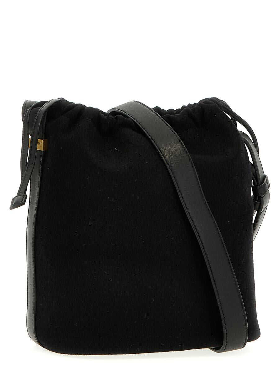 Felt pouch with front logo, leather details, drawstring closure, removable inner clutch bag with zip, adjustable shoulder strap