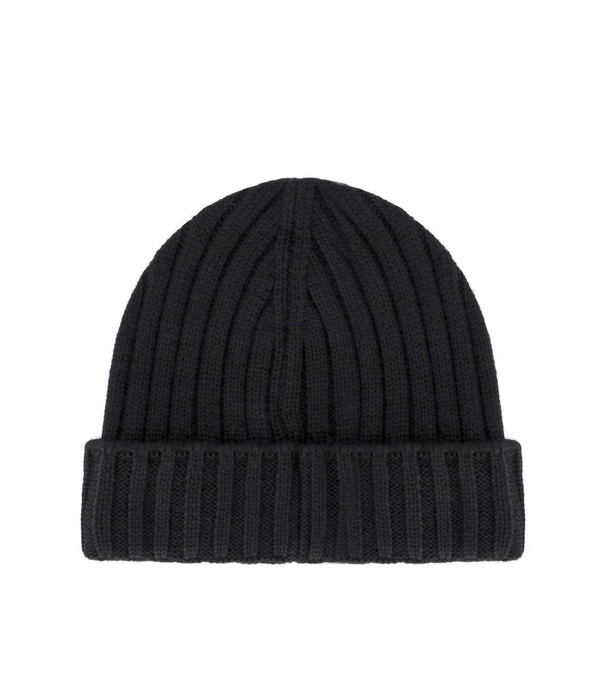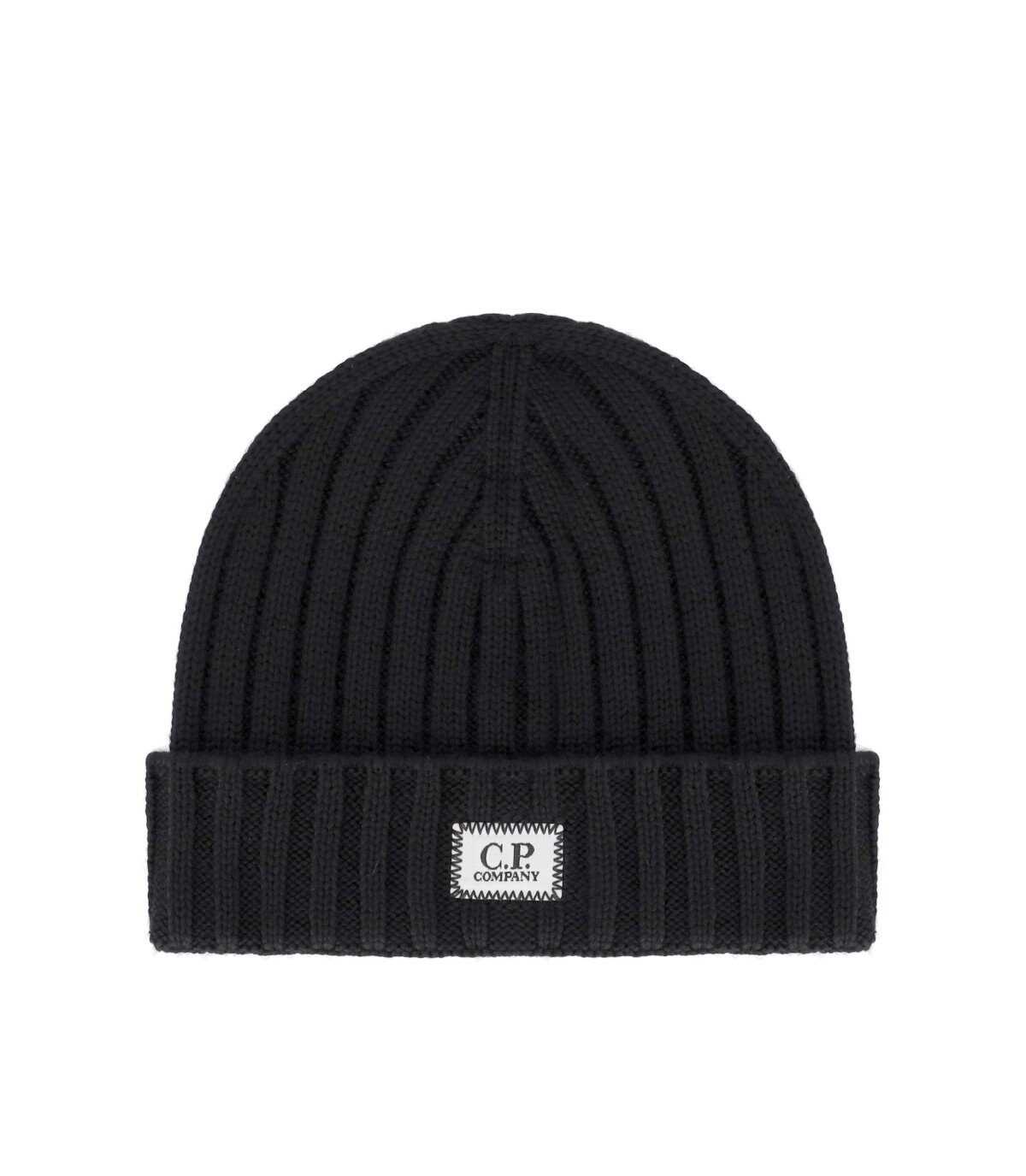 C.P. Company beanie made of wool, in black color. Characterized by a ribbed texture, it features a fabric logo label embroidered on the front cuff.