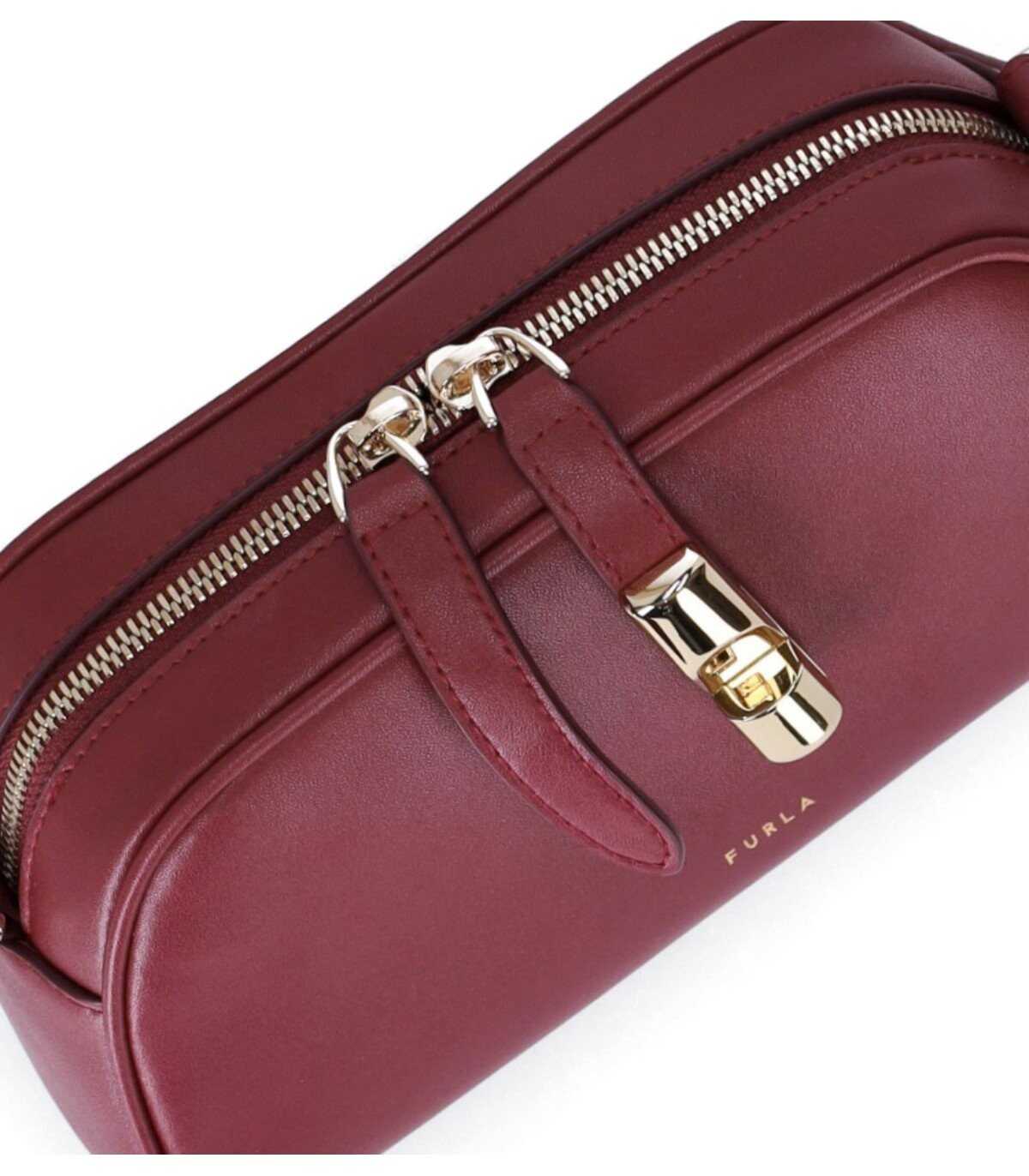 Goccia Mini shoulder bag by Furla made of precious leather, finished with refined details in cherry red tones. Characterized by a zip closure, it is adorned with a glossy gold-colored cylinder featuring the Arco logo embossed on one of the two leather pullers. Internally lined, it has an internal wall pocket with a zip closure. Fixed, adjustable shoulder strap. Dimensions, 23.5 x 12.5 x 6.5 cm.
