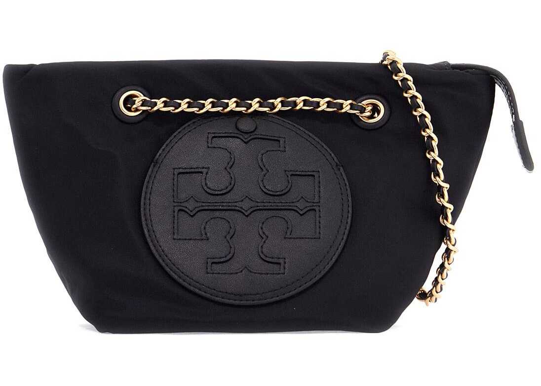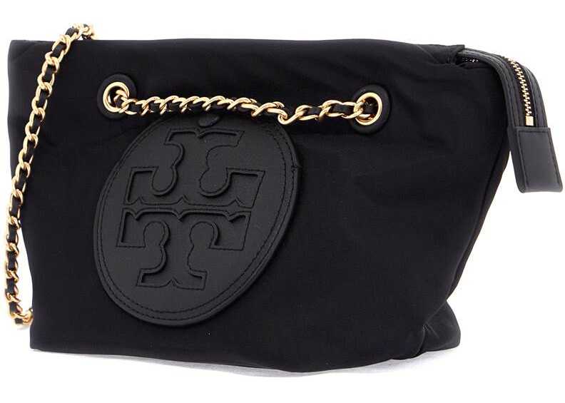 The small Ella shoulder bag by Tory Burch is made of recycled nylon, with a slightly deconstructed shape and classic front patch in leather featuring the iconic double T logo. The top closure has a zip, while the interior is lined with nylon and includes an open pocket. The double sliding chain handle is intertwined with leather and can be converted into a crossbody strap. Finished with gold hardware.