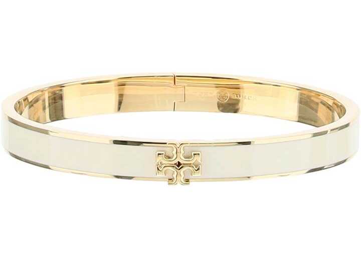 Kira cuff bracelet by Tory Burch crafted in gold-plated brass and smooth enamel. Joint closure under the iconic metal Double T detail. The item in photo is size S.